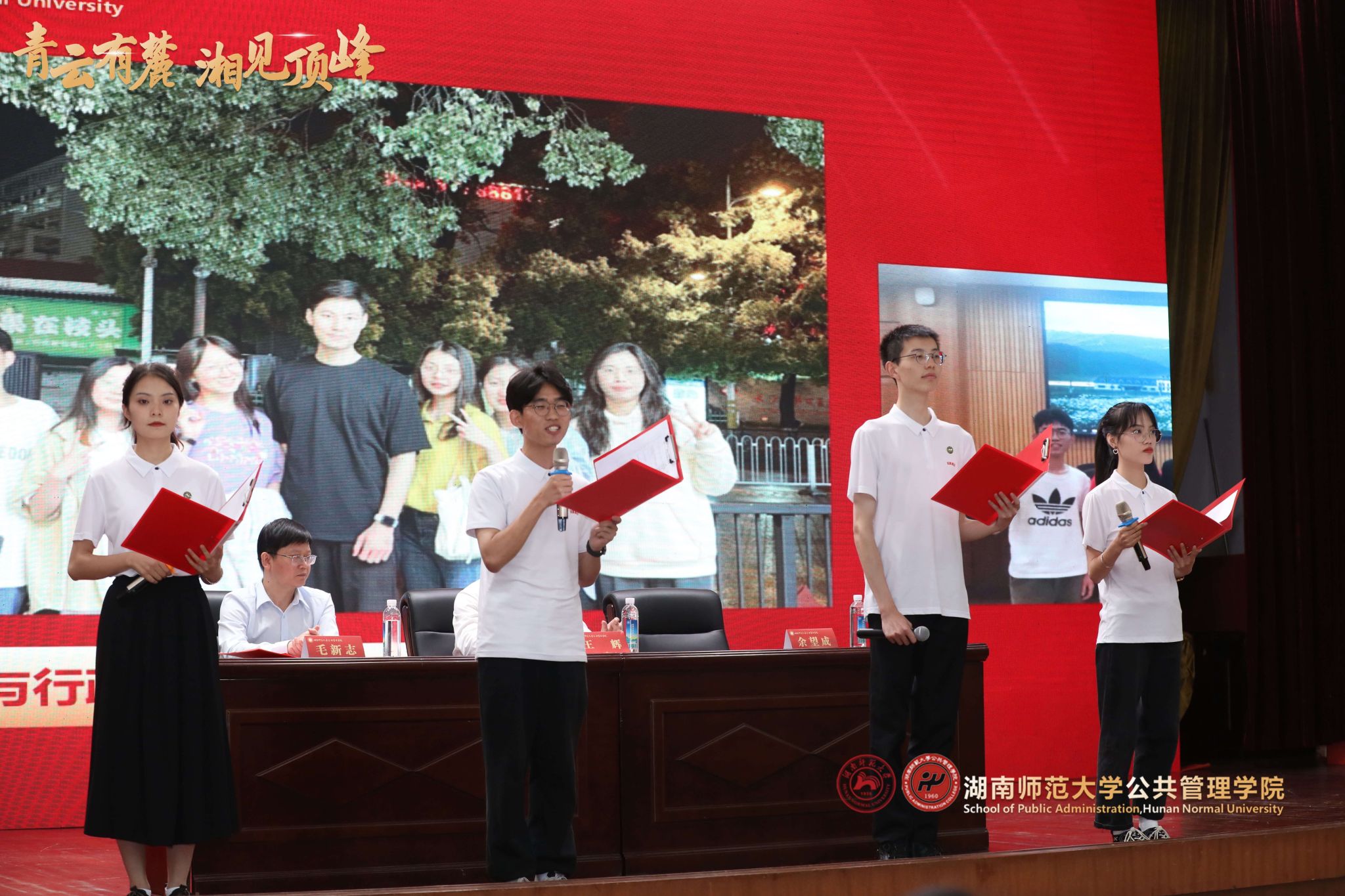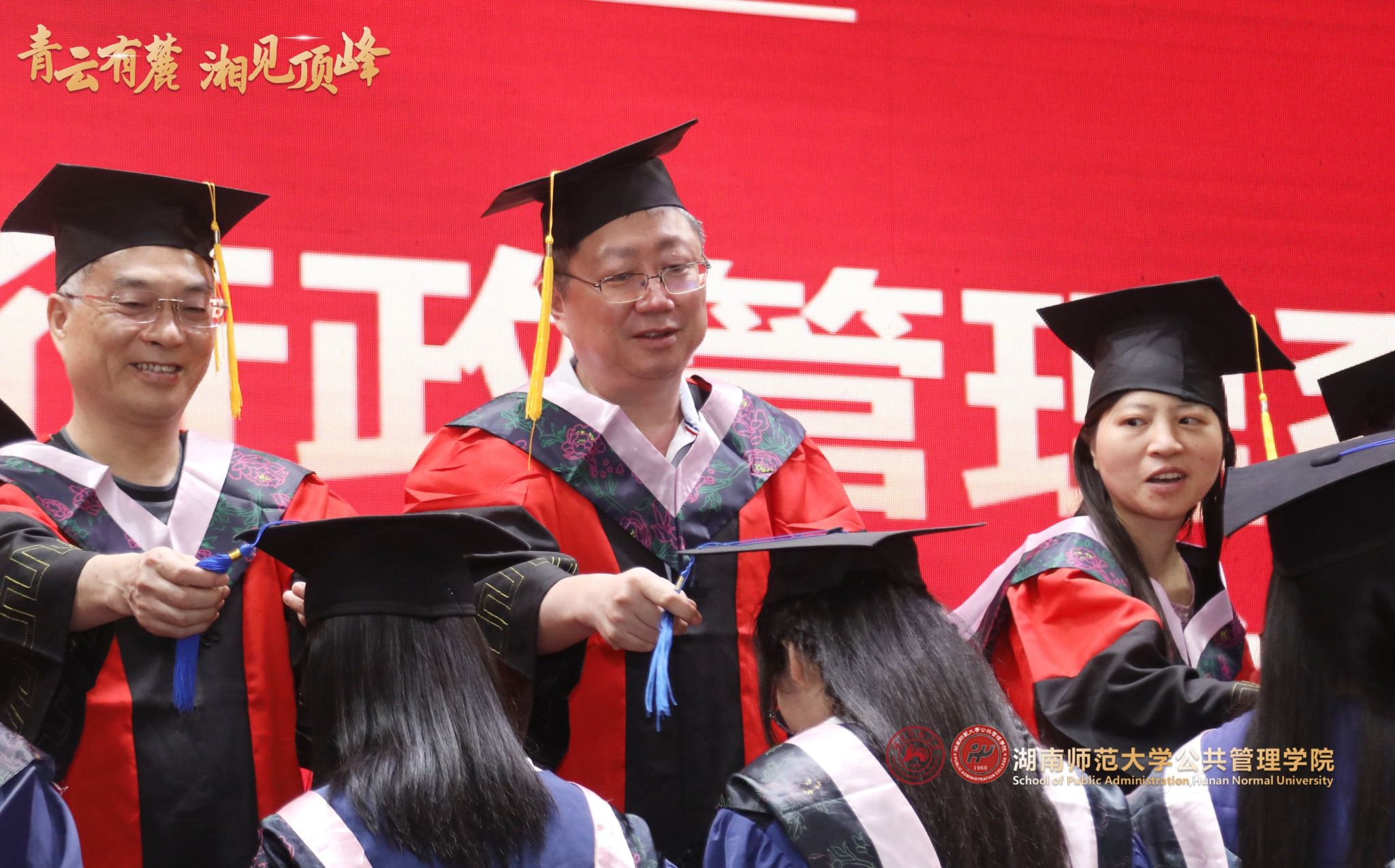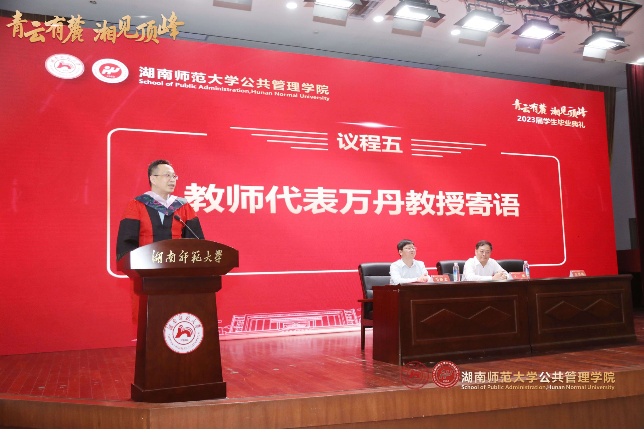 6月16日下午,9999js金沙老品牌“青云有麓,湘见顶峰”2023届毕业典礼暨学位授予仪式在湖南师范大学国际学术报告厅隆重举行。学院党委书记余望成主持毕业典礼。湖南师范大学副校长王辉,校友总会副秘书长邝洁、贺慧星,社科处副处长李超民等学校和职能部门负责同志;9999js金沙老品牌院长毛新志,道德文化研究院院长兼哲学系系主任向玉乔,院党委副书记孙雯波,主管科研副院长、政治学一级学科学位点负责人王敏,主管本科教学副院长苏静,主管行政副院长胡雪松,道德文化研究院副院长文贤庆,社会学系系主任、社会学一级学科学位点负责人罗忠勇,政治学与行政管理系系主任何琴等学院和学系负责人;哲学一级学科学位点负责人张怀承、政治学科科学社会主义博士点负责人周小毛、社会工作专业硕士点负责人孙建娥、MPA专业硕士点负责人刘茜等学位点导师代表以及本科毕业生班导师、研办和学工办的老师出席毕业典礼。