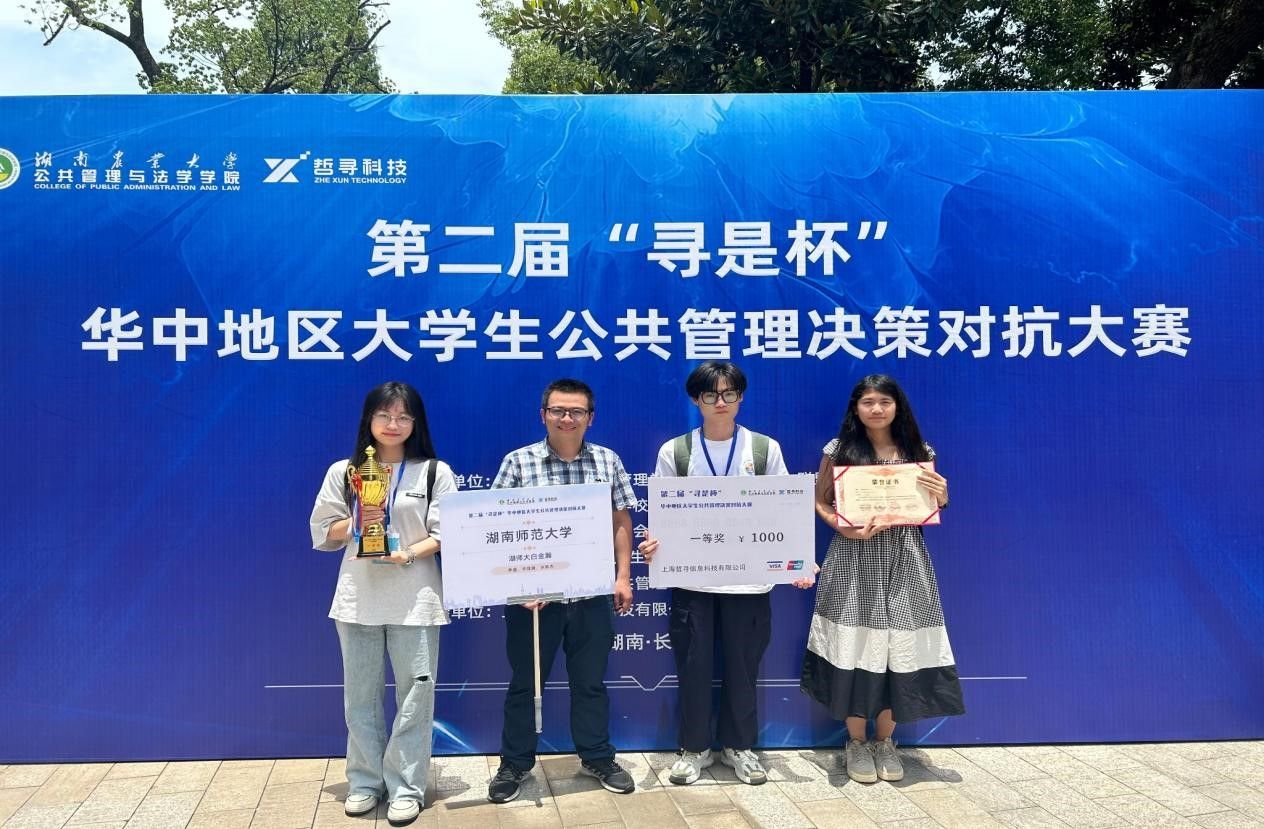 6月10日至11日,第二届“寻是杯”华中地区大学生公共管理决策对抗大赛在湖南农业大学成功举办,9999js金沙老品牌政治学与行政管理系组队参赛。由谢宗藩老师任指导老师,李捷、许建爽、张新杰三位同学组成的“湖师大白金瀚队”,通过创新方案设计与反复模拟对抗,在与华中科技大学、中南大学、郑州大学、中南财经政法大学、湖南农业大学等45所高校、46支队伍的激烈角逐中,荣获一等奖。