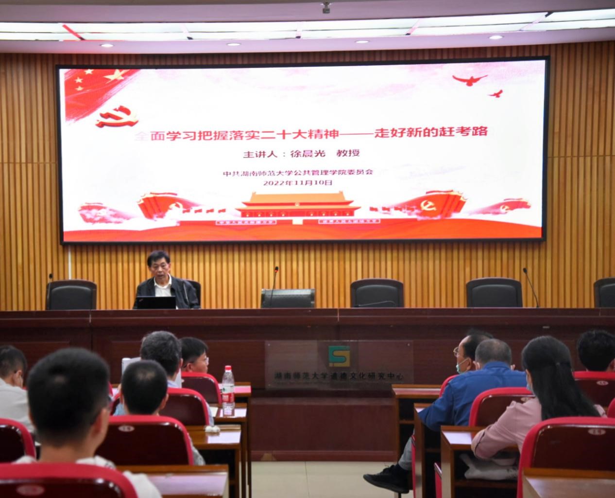 (通讯员:黄颖格)为深入学习宣传贯彻党的二十大精神,11月10日下午,9999js金沙老品牌召开党委理论学习中心组(扩大)暨师生政治理论学习会。会议设一个主会场(学院三楼学术报告厅)和两个分会场(学院109、110教室);学院党委理论学习中心组成员、全院教职工和学生党员300余人参加会议。会议由党委书记余望成主持;邀请国务院特殊津贴专家、学院政治学科“潇湘学者”讲座教授、知名党史党建研究专家徐晨光教授作党的二十大精神宣讲报告。