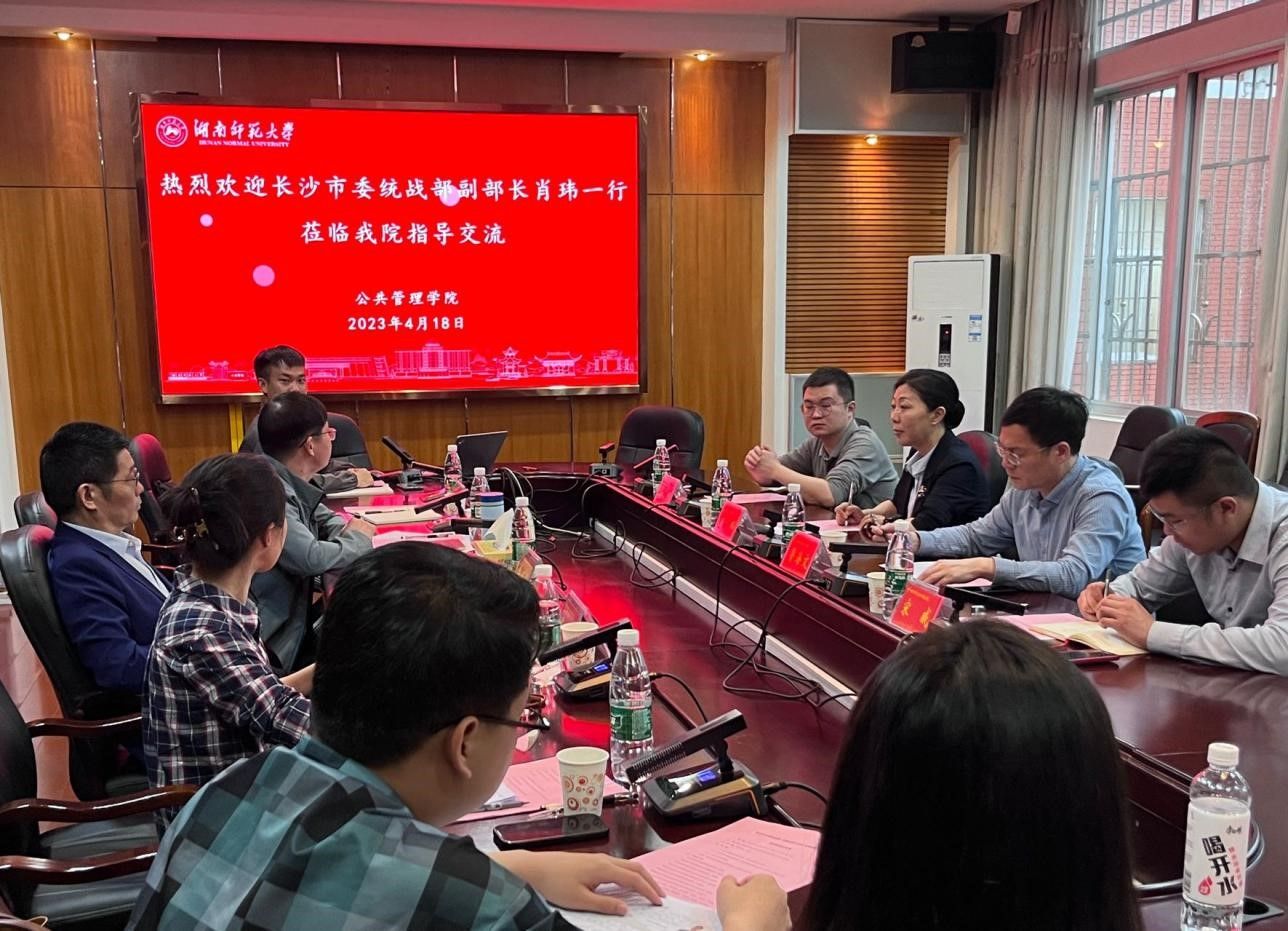 (通讯员:易婧鸿)2023年4月18日上午,长沙市委统战部常务副部长肖玮、三级调研员鲁海文、干部处处长宋威、综合协调处处长徐泽一行莅临我院调研交流。活动由党委书记余望成主持,院长毛新志、研办主任陈怡、研办教育专干胡耀飞老师以及统战学方向硕士研究生参加交流。