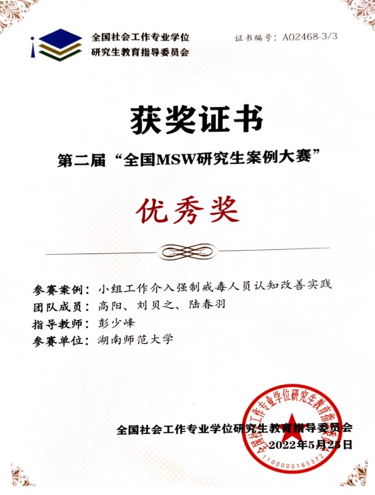 近期,第二届全国MSW研究生案例大赛决赛暨颁奖典礼在线上举行,我院彭少峰副教授指导,社会工作专业硕士生高阳、刘贝之、陆春羽团队撰写的案例《小组工作介入强制戒毒人员认知改善实践》荣获优秀奖。