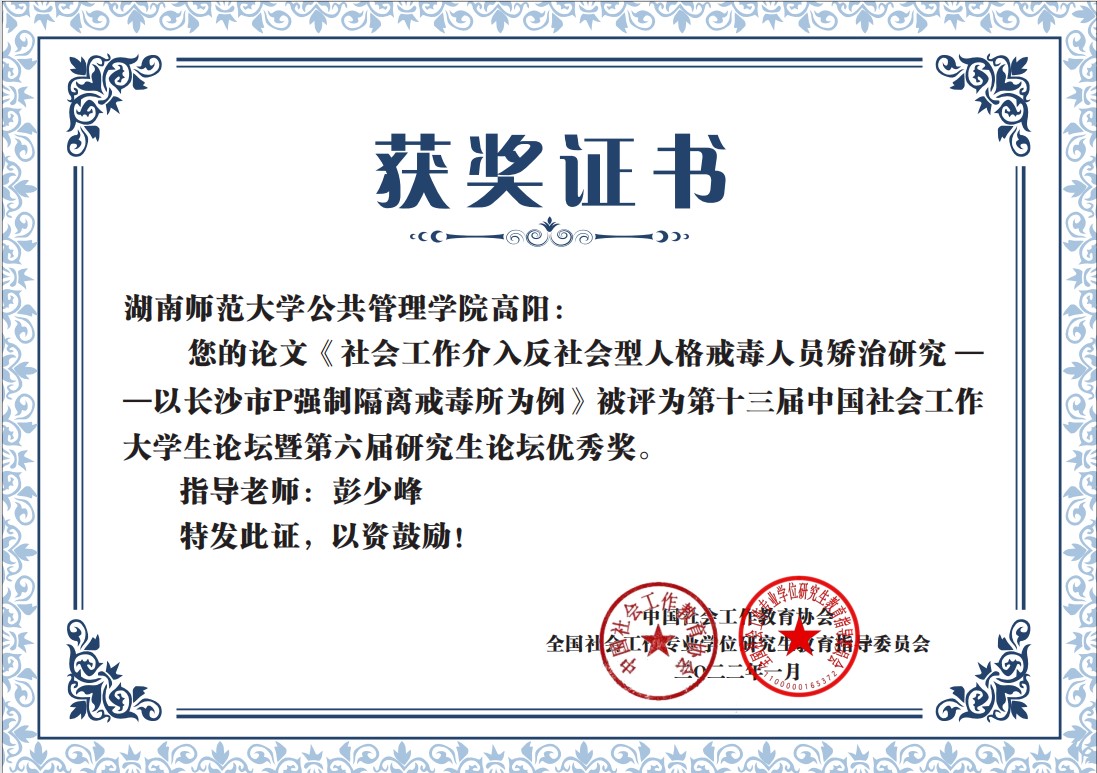 长期以来,学院高度重视MSW研究生培养模式改革和实践能力培养。学院研究生管理办公室大力支持鼓励学生参加实务竞赛和学术论坛。社会工作专业教师在案例选择、内容完善、申报技巧方面精心指导参赛学生。据悉,今年初高阳同学的论文《社会工作介入反社会型人格戒毒人员矫治研究》(指导老师:彭少峰)被评为第六届中国社会工作研究生论坛优秀奖(全国社会工作专业学位研究生教育指导委员会主办)。未来我院将继续鼓励、引导、支持MSW研究生紧密围绕着我国社会治理领域面临的重大热点难点问题开展案例研究,进一步提高专业学位硕士生培养质量。