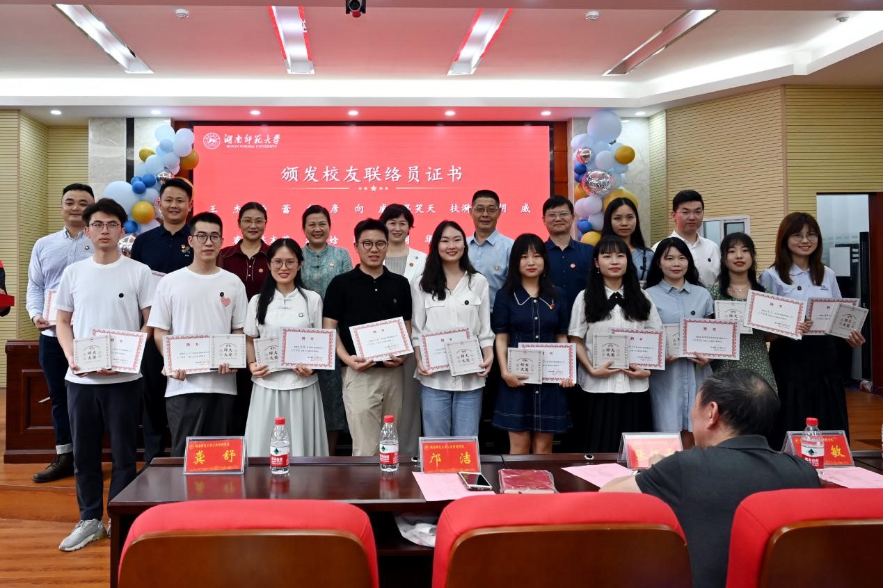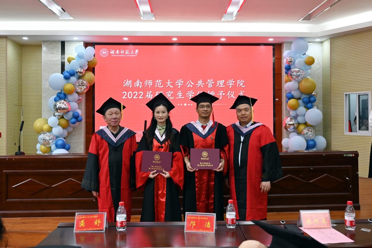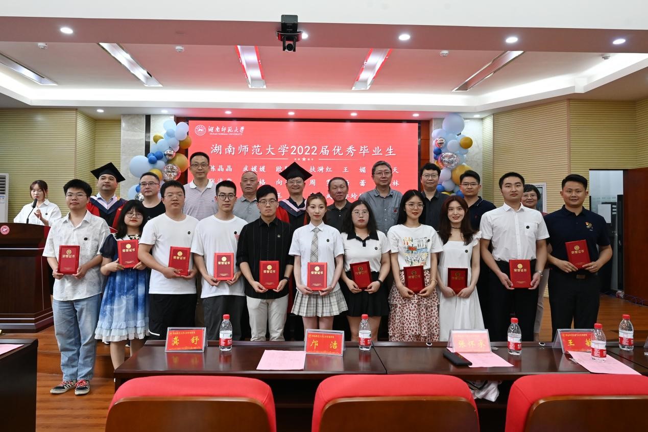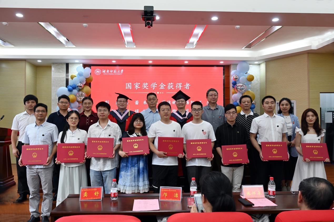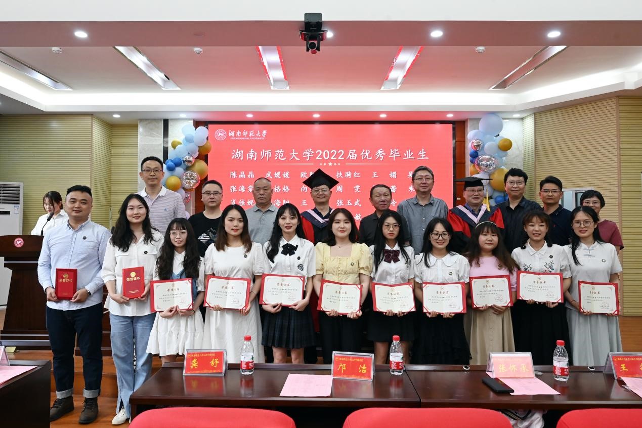 学院领导及各学位点负责人向国家奖学金、湖南省优秀毕业生、湖南师范大学优秀毕业生颁发荣誉证书。获奖同学依次上台领奖,并与各位领导和老师合影留念。