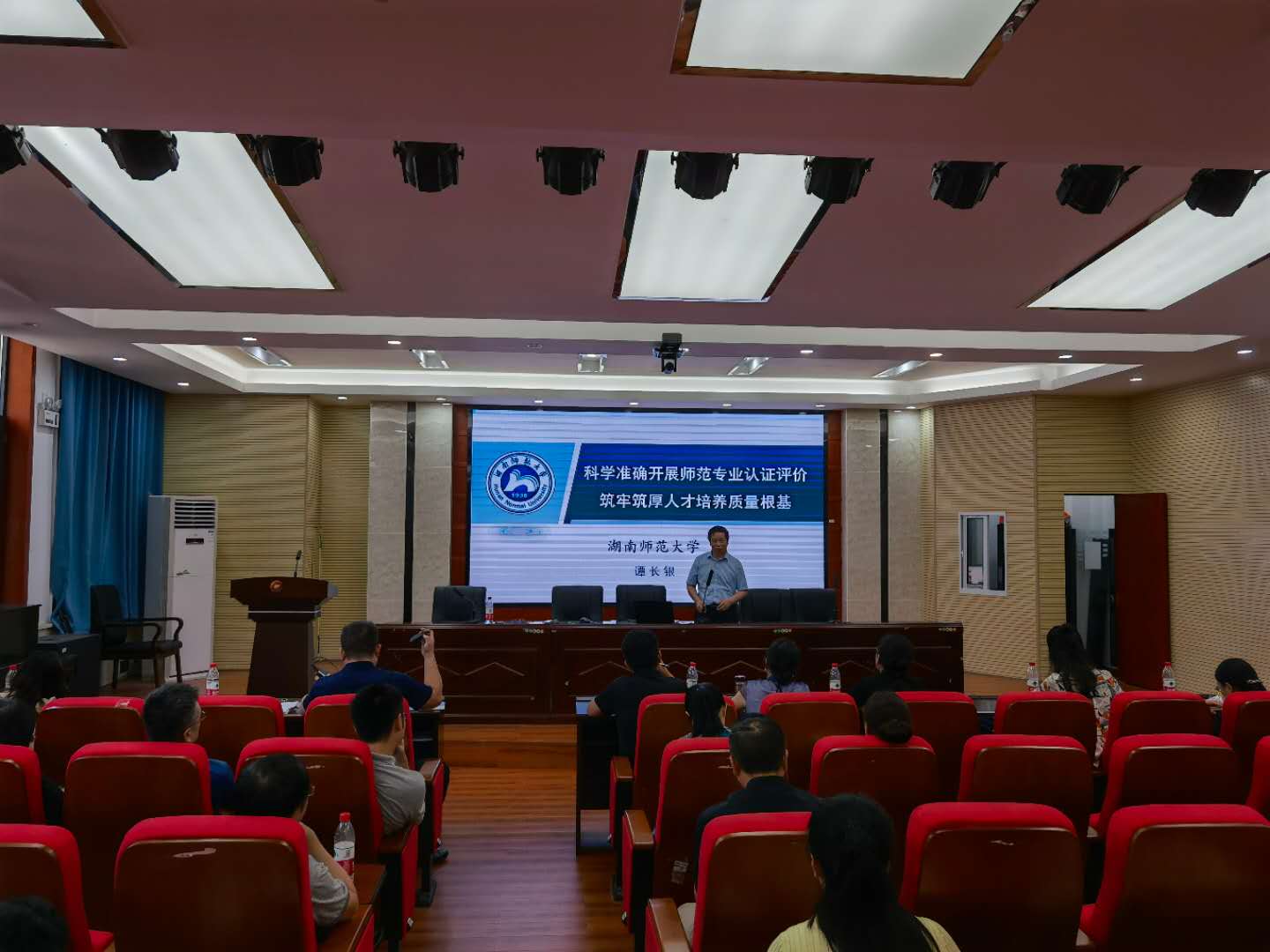 接着资环院谭长银副院长以“科学准确开展师范专业认证评价 筑牢筑厚人才培养质量根基”为题做了讲解,他围绕师范专业认证评价体系、人才培养目标合理性及达成情况评价、毕业要求合理性及达成情况评价、课程体系合理性评价、课程目标达成度评价五个方面做了具体阐述。