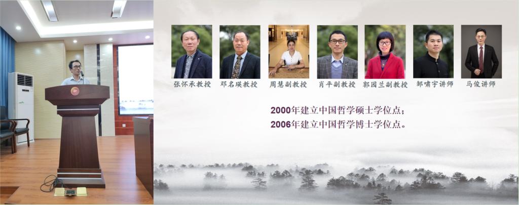 其次,马克思主义哲学教研室主任彭婷老师、中国哲学教研室主任肖平老师、外国哲学教研室主任张含老师、伦理学教研室文贤庆老师、科学技术哲学教研室主任李波老师、逻辑学教研室主任王淑庆老师、美学教研室主任张霖源老师、宗教学教研室主任尹哲老师,依次对各教研室的师资等情况作了简要而全面的介绍。
