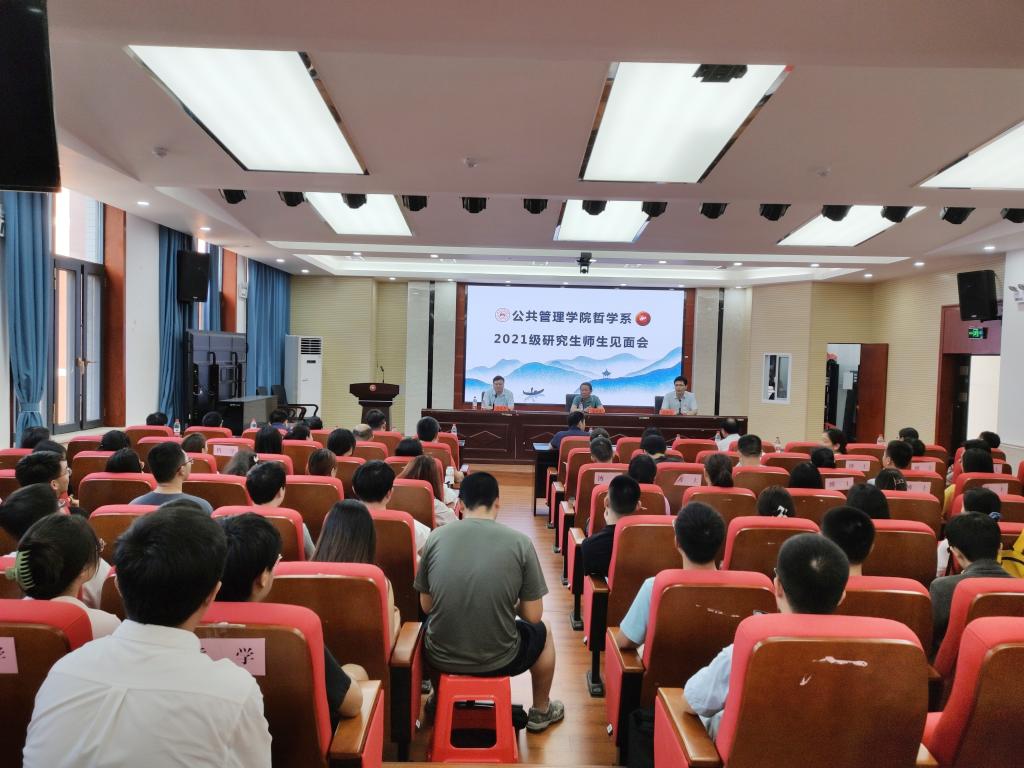 9月23日下午4时,哲学系在景德楼南栋四楼报告厅隆重举行2021级研究生师生见面会。学位点负责人张怀承教授、系主任向玉乔教授、王泽应教授、万丹教授、朱海林教授、孙雯波副教授、文贤庆副教授、丁小平副教授、郭园兰副教授、刘大为老师、邹啸宇老师、黄泰轲老师、肖根牛老师、王大封老师,以及八个二级学科的教研室主任等20余位教师出席会议,共同欢迎51位硕士新生和12位博士新生的到来。见面会由系副主任孙保学老师主持。