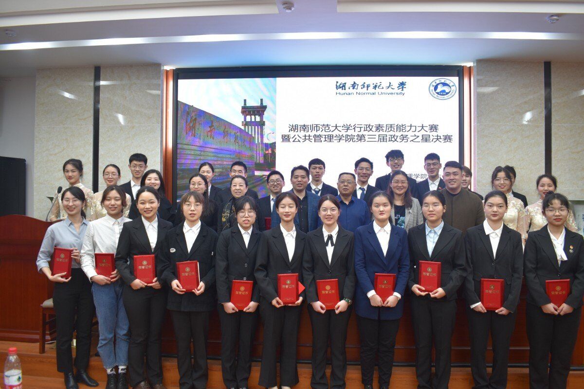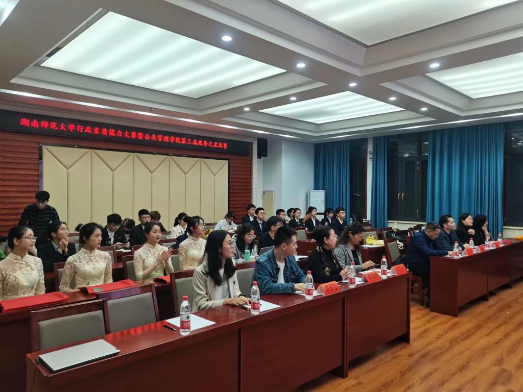 (通讯员 李诗语 冯润志 邓博瑞)4月15日晚19时至22时,湖南师范大学行政素质能力大赛暨9999js金沙老品牌第三届政务之星总决赛在公管院博后楼学术报告厅举行。此次比赛的参会人员有招生与就业指导处副处长周俊,公管院党委副书记孙雯波,公管院社会学系老师胡建新,考德上教育董事长田亚东,考德上教育河西分校校长邓叶琴,招生与就业指导处就业管理科王术芳老师,公管院团委书记、学工办主任林哲旭老师,18级辅导员曹滟梅老师,19级辅导员易晓老师,20级辅导员胡耀飞老师,此次大赛决赛选手及公管院学生会学业发展部成员。
