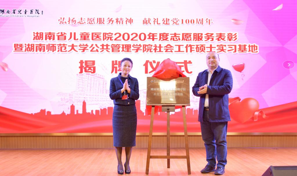 2021年4月2日下午,我院与湖南省儿童医院在其新外科大楼26楼大礼堂隆重举行社会工作硕士实习基地揭牌仪式,在揭牌仪式前湖南省儿童医院还对其2020年度志愿服务先进单位和个人进行了表彰。揭牌仪式由省儿童医院社工部主任王幸主持,省儿童医院党委书记谭李红、工会主席王可为参加仪式。我院副院长李超民、社会工作硕士教育中心主任孙建娥、社会学系冯元博士及部分2020级社会工作硕士研究生和2019级社会学本科生等参加了此次活动。