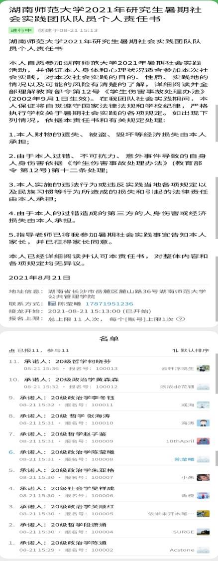 最后,实践队队长陈莹曦对暑期实践队工作进行具体安排,要求全体成员认真填写湖南师范大学2021年研究生暑期社会实践团队队员个人责任书,并就疫情防控等方面存在的安全问题提出了具体的防范措施。