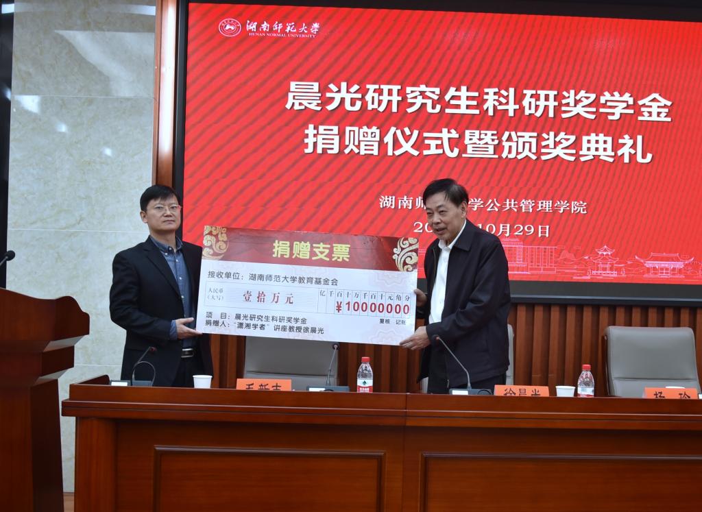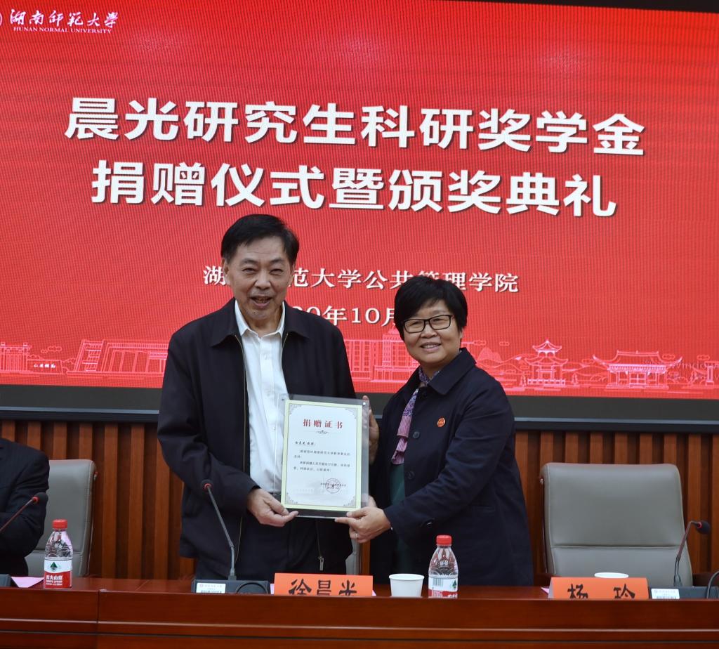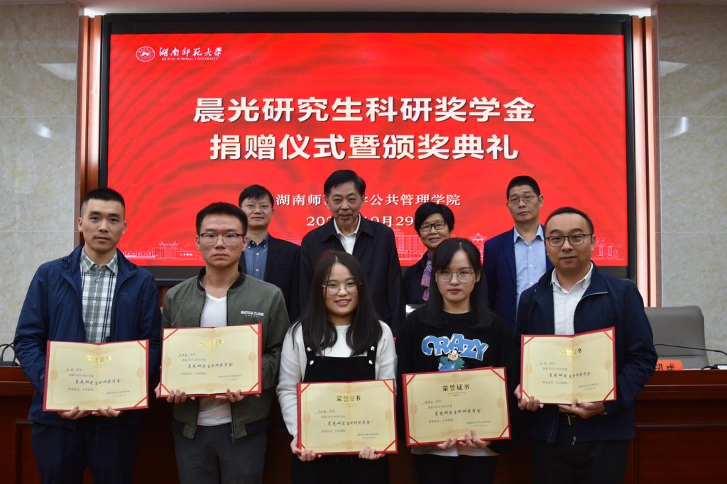 (通讯员宋文艳)2020年10月29日上午,晨光研究生科研奖学金捐赠仪式暨颁奖典礼在博后楼三楼学术报告厅举行。著名党建专家、我校潇湘学者讲座教授徐晨光,教育基金会秘书长杨玲,9999js金沙老品牌党委书记余望成,院长毛新志,副院长王敏、赵子林、李超民、邝洁,以及政治学学科的研究生导师代表出席了此次活动。仪式由赵子林副院长主持。