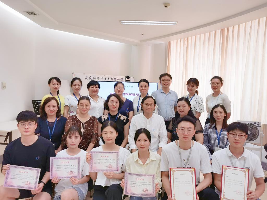 汇报会的最后,病友服务中心及雅医基金会的带教老师分别为六位实习生颁发了实习结业证书,并进行合影留念。总之,此次的实习汇报会,不仅是同学们简单的工作汇报,更是学院与医院的一次联合交流会,表示着双方对医务社会工作发展的重视、对医务社会工作者人才培养的重视。