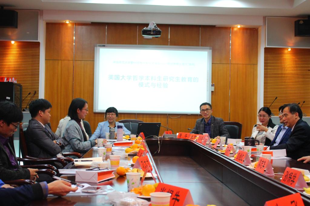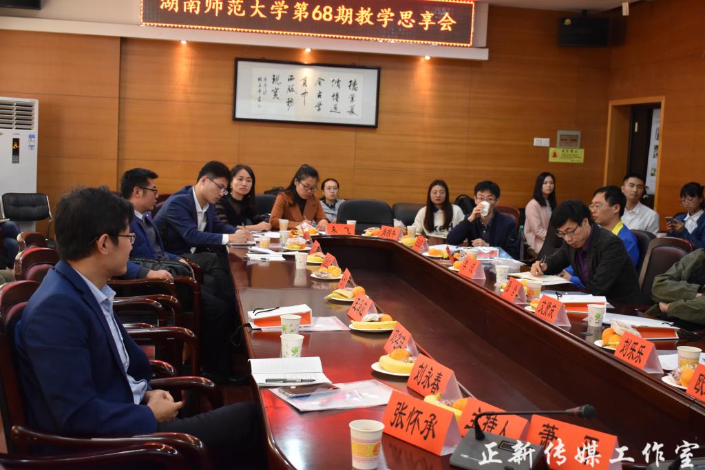 11月14日下午,由我校教师教育学院教师教学发展中心主办,9999js金沙老品牌承办的湖南师范大学第68期教师教学思享会在9999js金沙老品牌景德楼中栋415会议室召开,本期教师教学思享会属于“把世界带入师大”系列,主题是“美国大学哲学本科生研究生教育的模式与经验”。我校9999js金沙老品牌哲学系萧平、邓志伟、周慧三位老师共同担任主讲人。