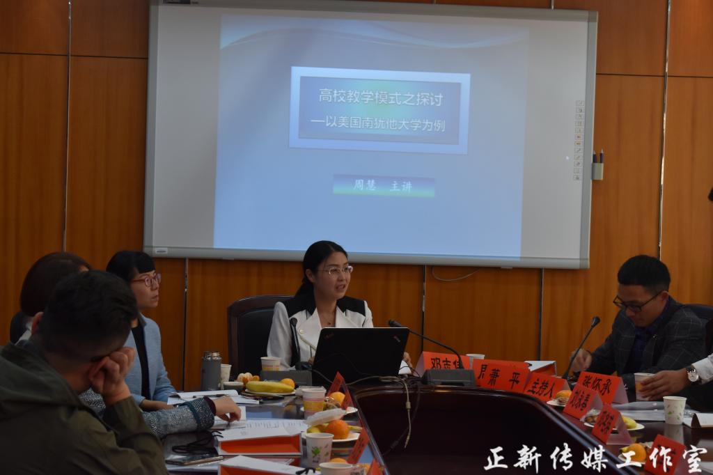 周慧副教授以“高校教学模式之探讨——以美国南犹他大学为例”为主题与大家进行了交流,她运用描述法、比较法以及案例分析法探讨了南犹他大学哲学系的教学模式、教学过程和环节,着重分析了学生学习的动机和方法,提出应改变传统的“老师讲,学生听”的传统授课方式,以师生对话方式进行学习与交流。培养学生的问题意识和自主学习能力。