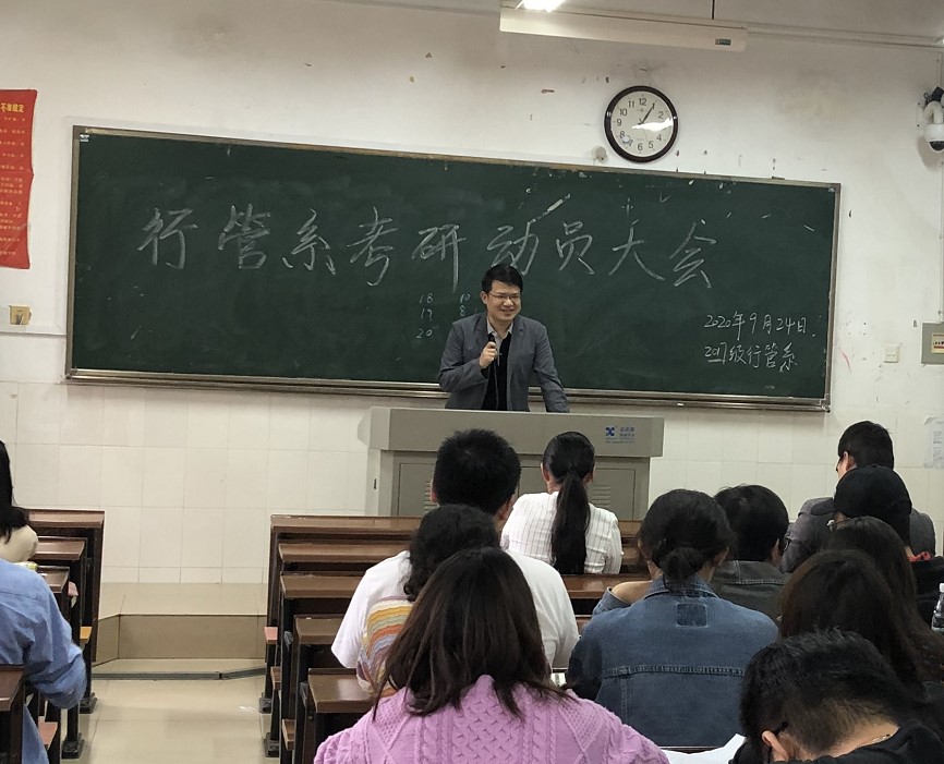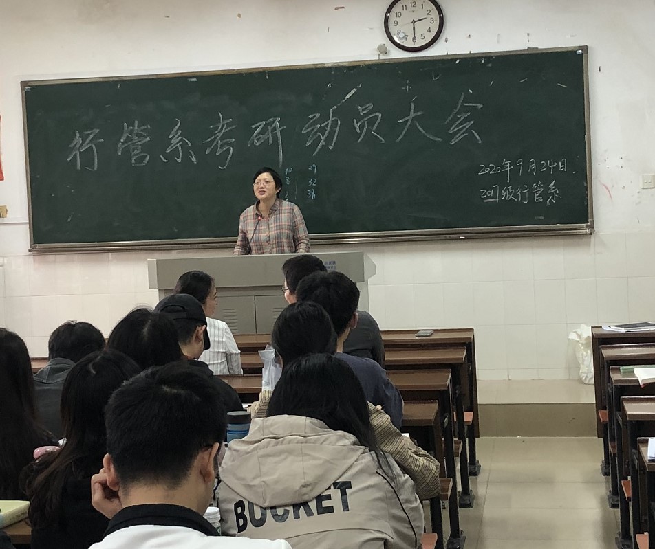 2020年9月24日,9999js金沙老品牌行政管理系在9999js金沙老品牌113教室召开了考研动员大会,行政管理系2017级全体本科生参与会议,行政管理系陈晓红教授、成程老师、付振奇老师、王劲嵛老师参会并向同学们传授了考研经验,会议由行政管理系系主任何琴老师主持。