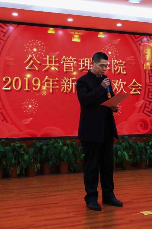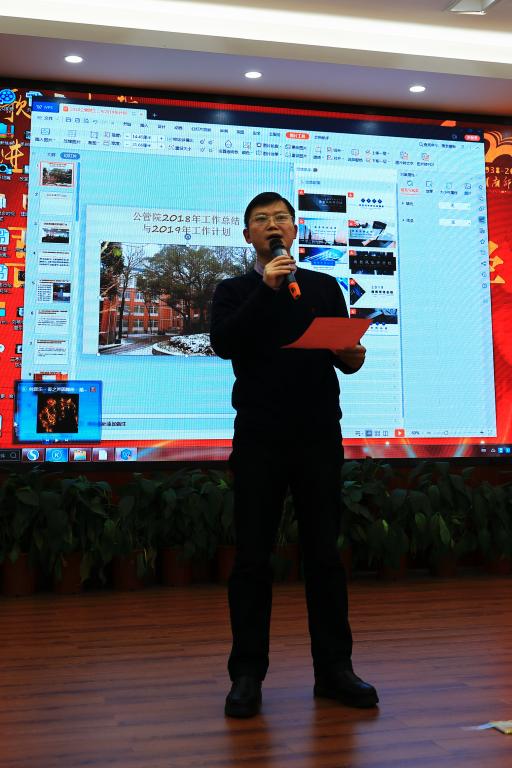 院长毛新志致辞。毛新志代表学院向全体教职工表示新春的问候,并回顾了2018年学院在教学、科研、学生培养以及党务行政等方面取得的丰硕成绩,对下年度工作进行部署和展望,对年度获奖集体和个人进行了表彰和颁奖。