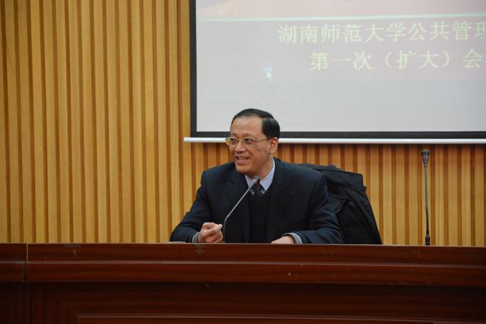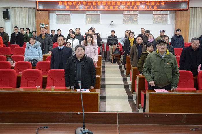 第一阶段会议由副院长杨君武主持。会议伊始,全体起立,奏唱国歌。原工会委员会主席陈晓红通报会议筹备工作和参会人员情况,在对新一届工会委员候选人名单的产生进行说明后组织进行工会委员选举。余望成在院2017年年度工作报告中从各个方面详细介绍了公管院一年取得的成绩,他重点阐述了2017年院的学科建设情况,在讲话中他提出对青年教师进行扶助以及工作“稳中求进”的策略。副院长邝洁对2017年度财务情况做简单报告。之后,余望成宣布新一届工会委员名单以及院“和谐家庭”当选结果。