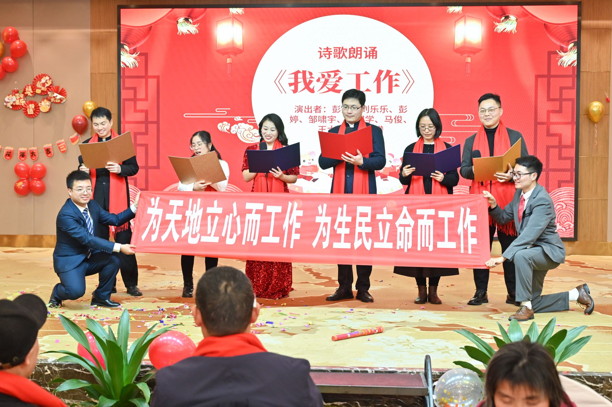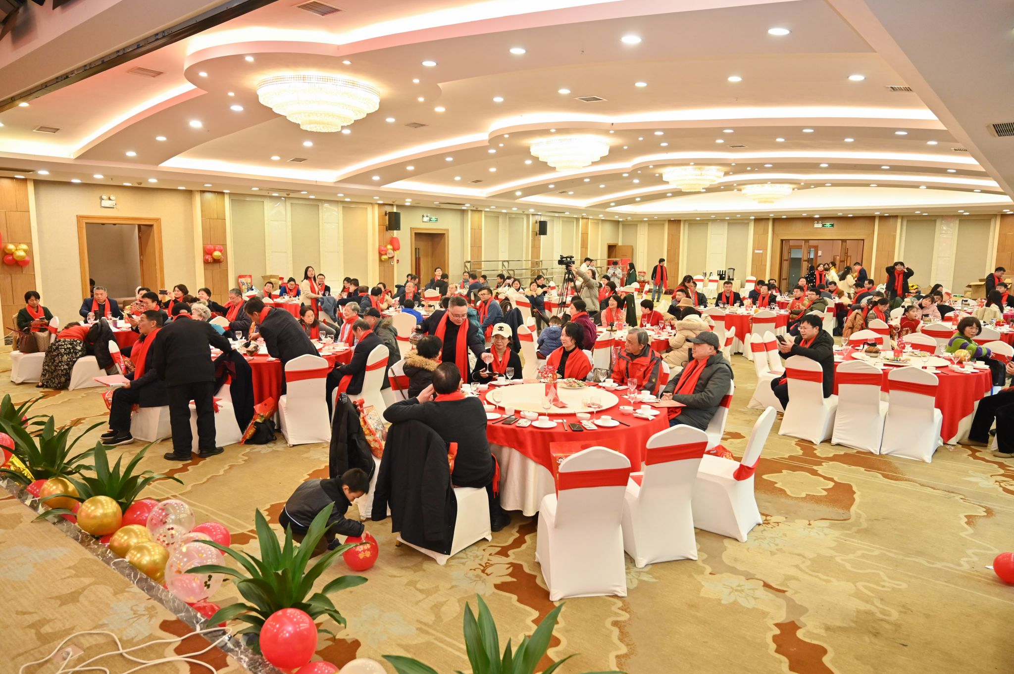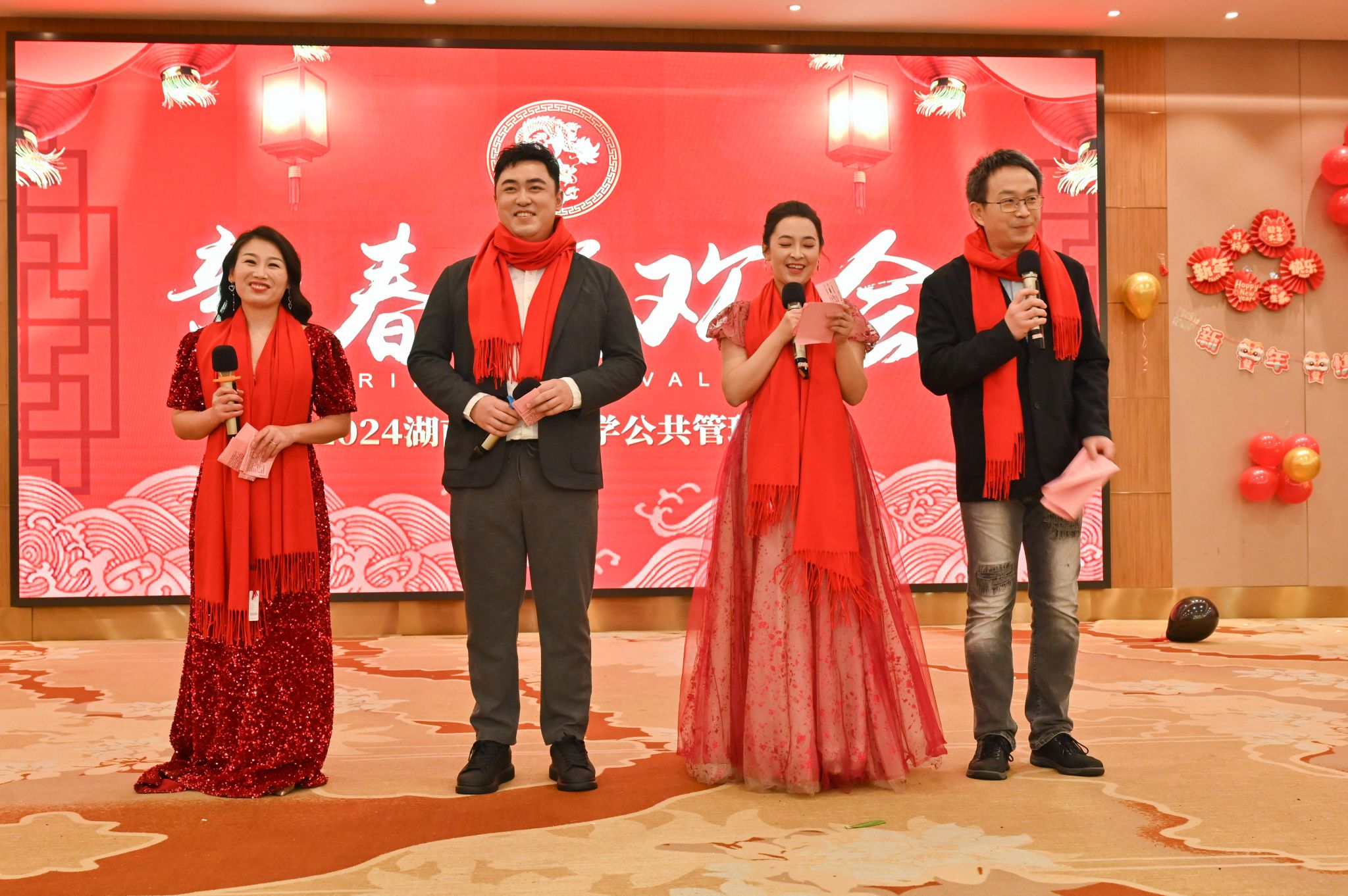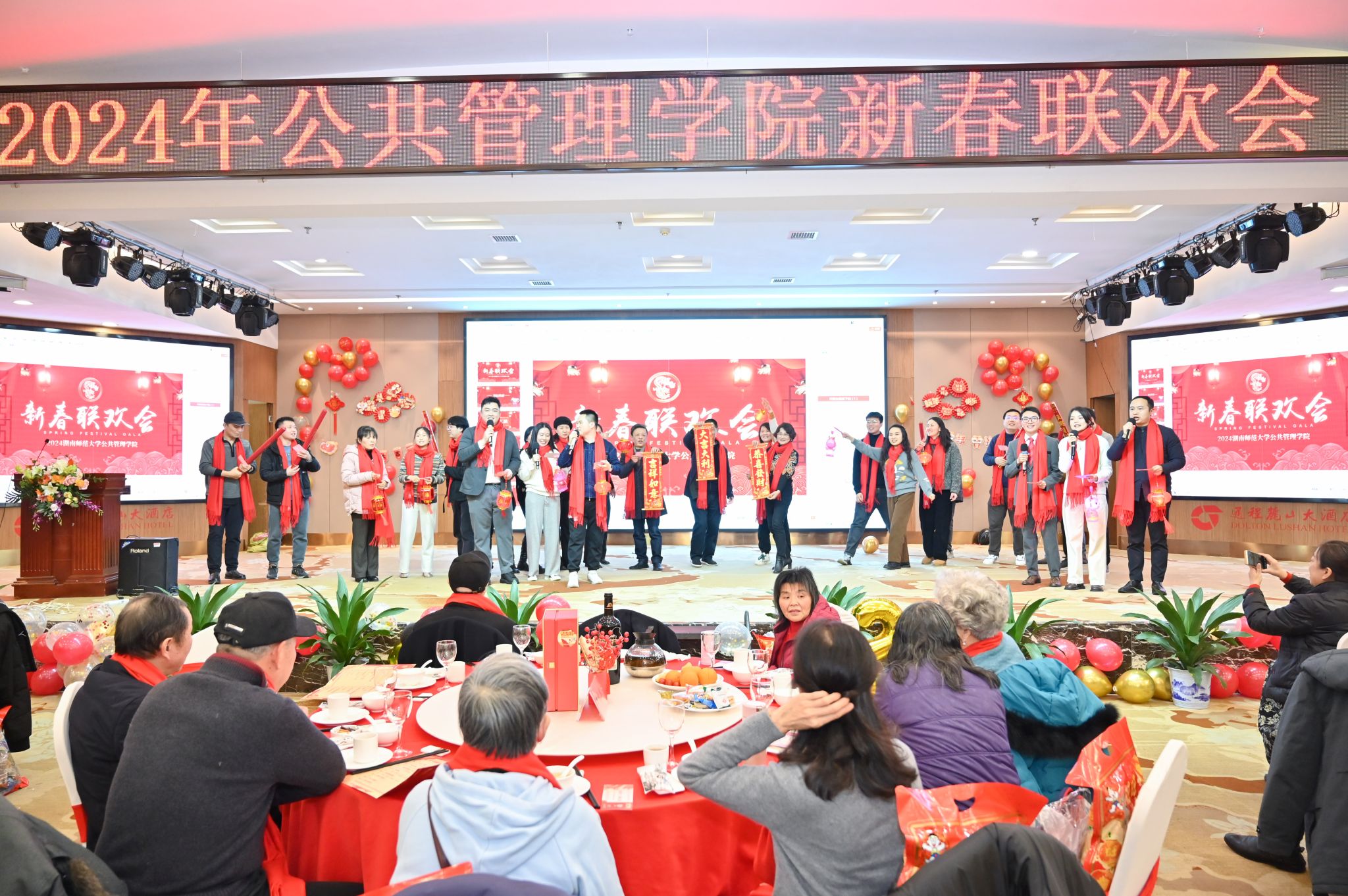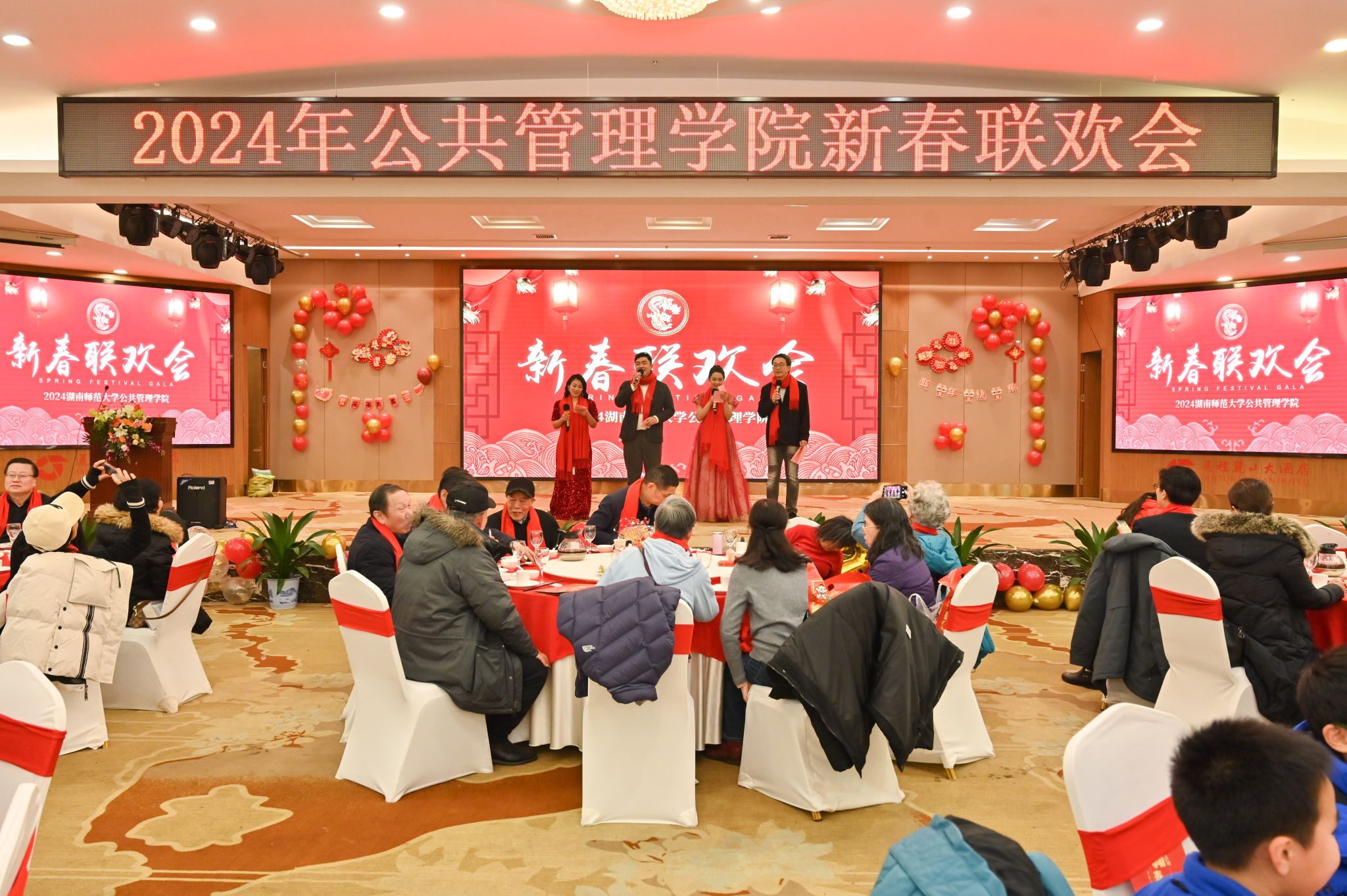 1月19日,9999js金沙老品牌130余名在职教职工与离退休教职工在通程麓山国际大酒店湘江宴会厅举行2024年“和美师大 日新公管”新春联欢会。