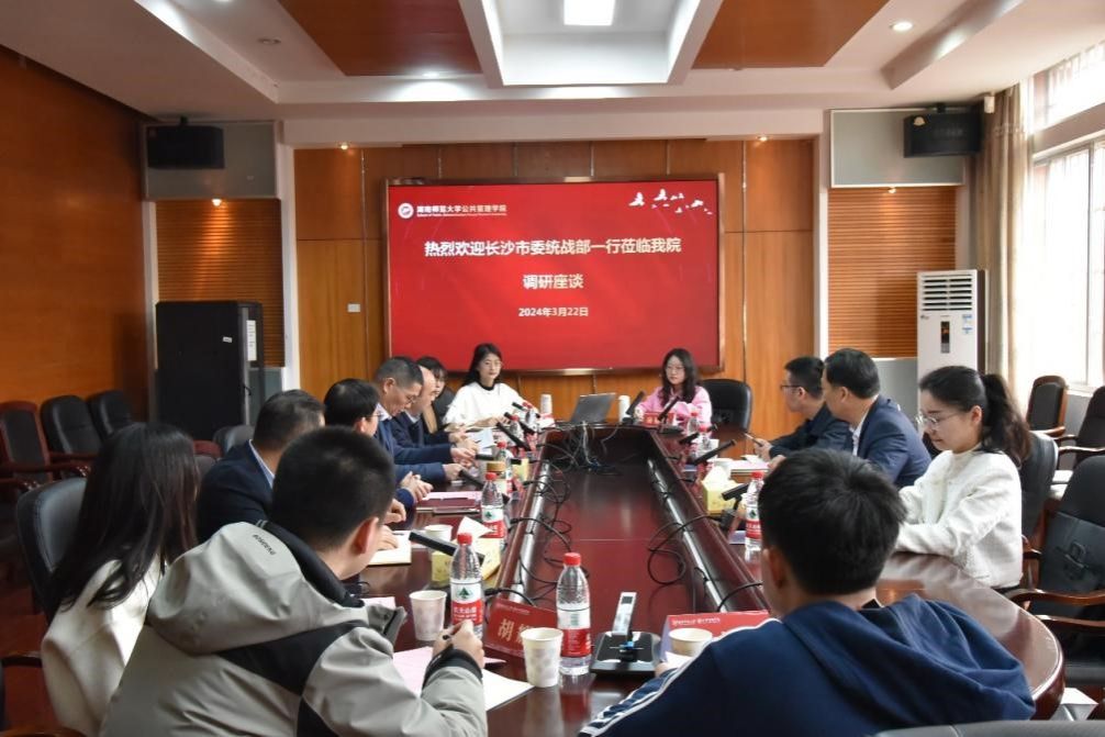 (通讯员江云艳)2024年3月22日上午,长沙市委统战部副部长、市政府侨办主任杨光华,长沙市委统战部研究室主任胡振强以及研究室干部陈丽萍莅临我院调研交流。我院党委书记余望成,院长毛新志教授,湖南省社会主义学院导师代表许奕锋教授,我校社科处副处长、统一战线学学位点负责人李超民教授,我院研办主任陈怡、辅导员胡耀飞以及统战方向硕士研究生代表参加了会议。会议由党委书记余望成主持。