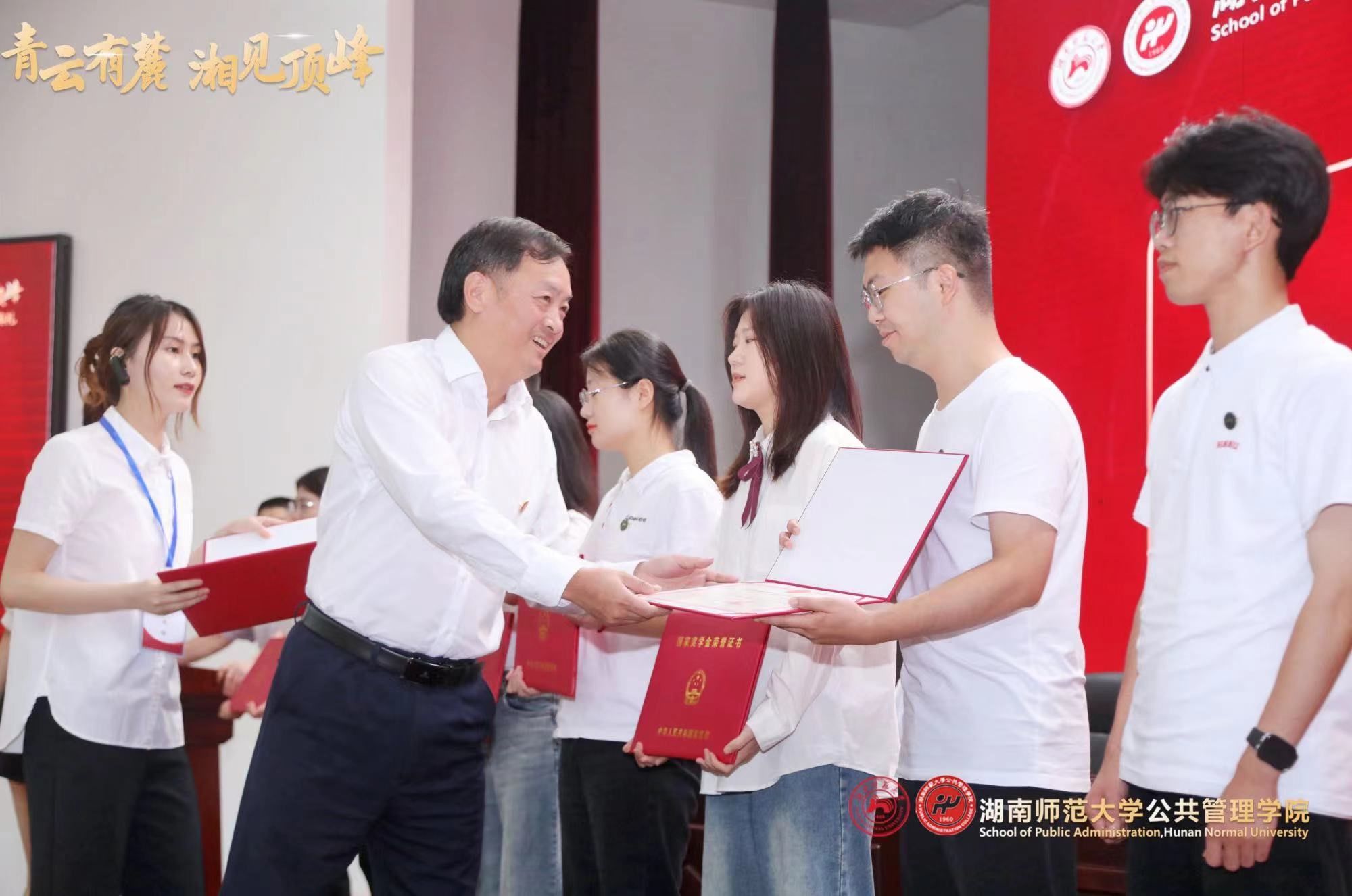 主持人余望成书记依次宣读“国家奖学金”、“2023届湖南省优秀毕业生”、“2023届湖南师范大学优秀毕业生”以及“2023届湖南师范大学优秀本科毕业论文”获奖毕业生名单;受邀领导和嘉宾分别为获奖毕业生颁发荣誉证书并与获奖同学合影留念,表达对毕业生同学即将踏上锦绣前程、迈向未来的期许与祝福。