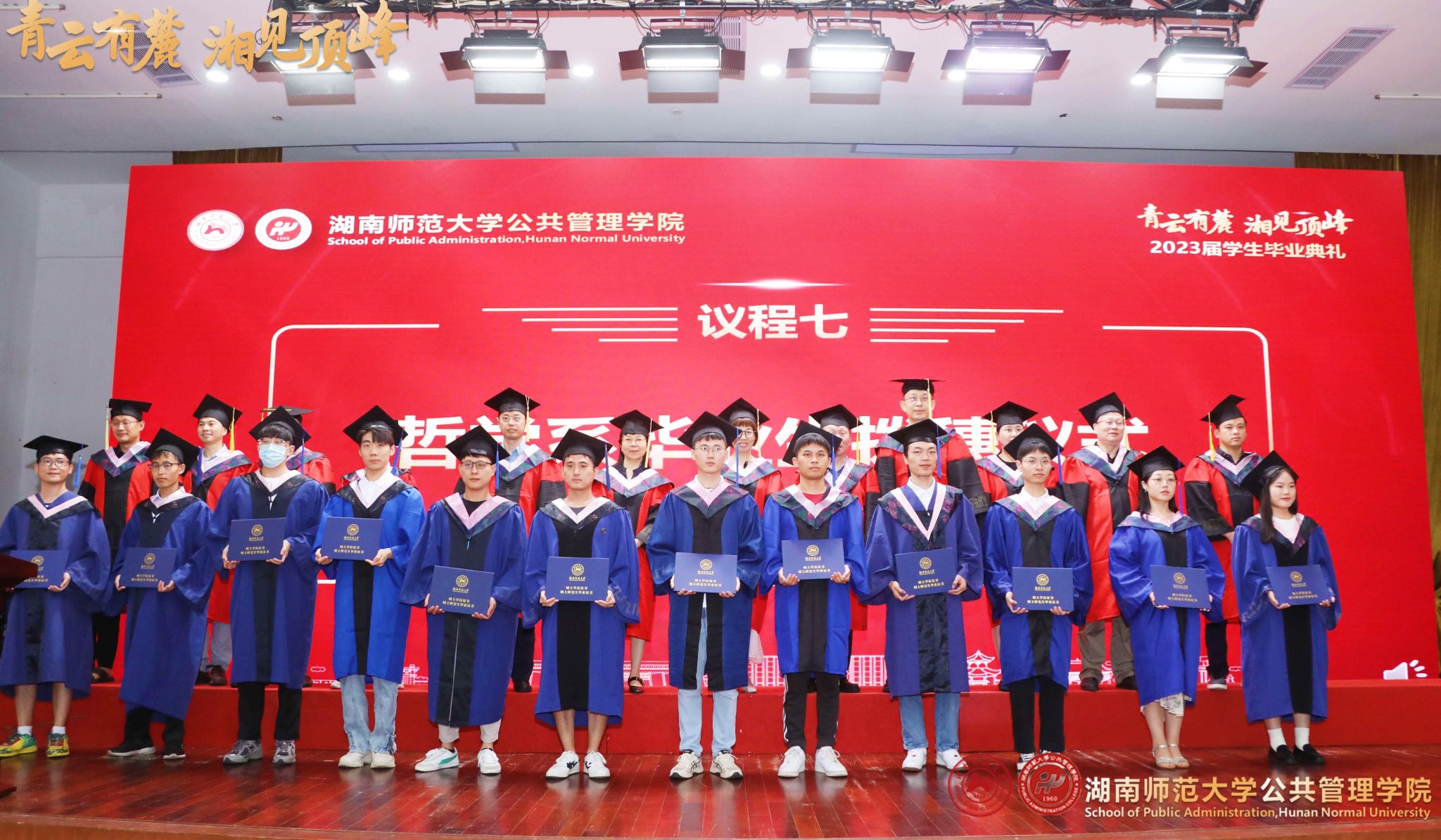 (通讯员 兰绍娴 金志敏 曾靖雯)6月16日下午,9999js金沙老品牌“青云有麓,湘见顶峰”2023届毕业典礼暨学位授予仪式在湖南师范大学国际学术报告厅隆重举行。学院党委书记余望成主持毕业典礼。湖南师范大学副校长王辉,校友总会副秘书长邝洁、贺慧星,社科处副处长李超民等学校和职能部门负责同志;9999js金沙老品牌院长毛新志,道德文化研究院院长兼哲学系系主任向玉乔,院党委副书记孙雯波,主管科研副院长、政治学一级学科学位点负责人王敏,主管本科教学副院长苏静,主管行政副院长胡雪松,道德文化研究院副院长文贤庆,社会学系系主任、社会学一级学科学位点负责人罗忠勇,政治学与行政管理系系主任何琴等学院和学系负责人;哲学一级学科学位点负责人张怀承、政治学科科学社会主义博士点负责人周小毛、社会工作专业硕士点负责人孙建娥、MPA专业硕士点负责人刘茜等学位点导师代表以及本科毕业生班导师、研办和学工办的老师出席毕业典礼。