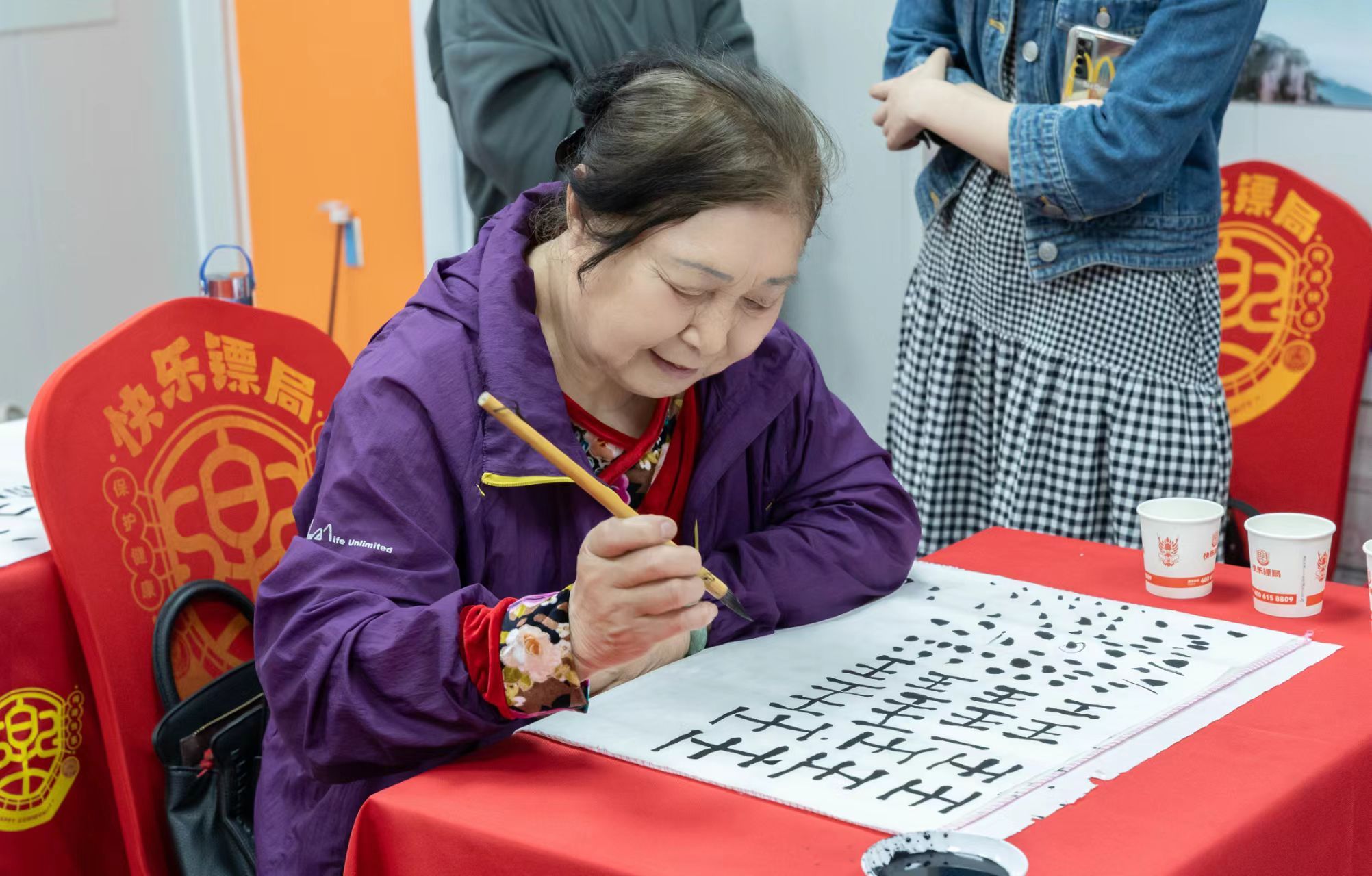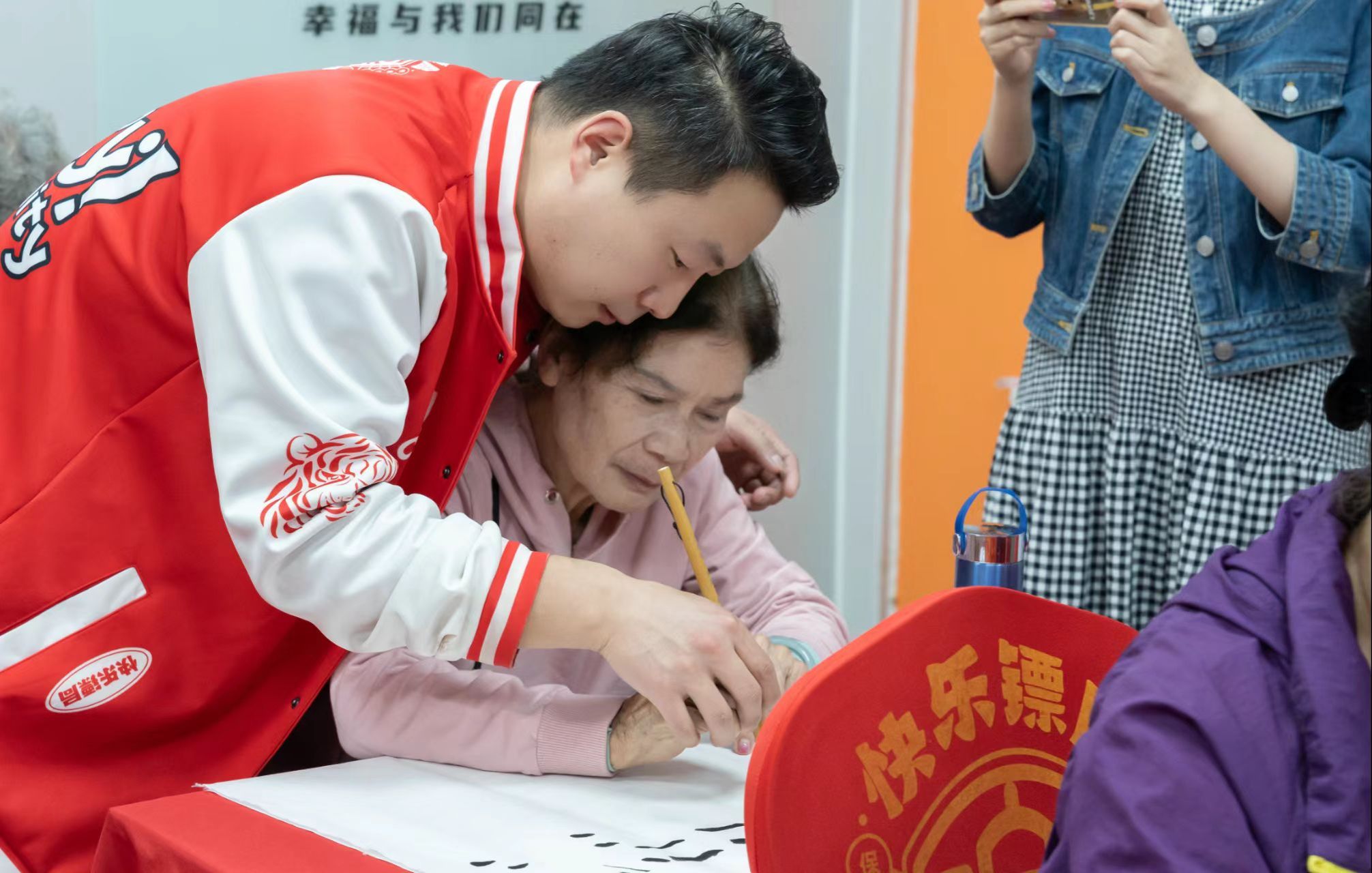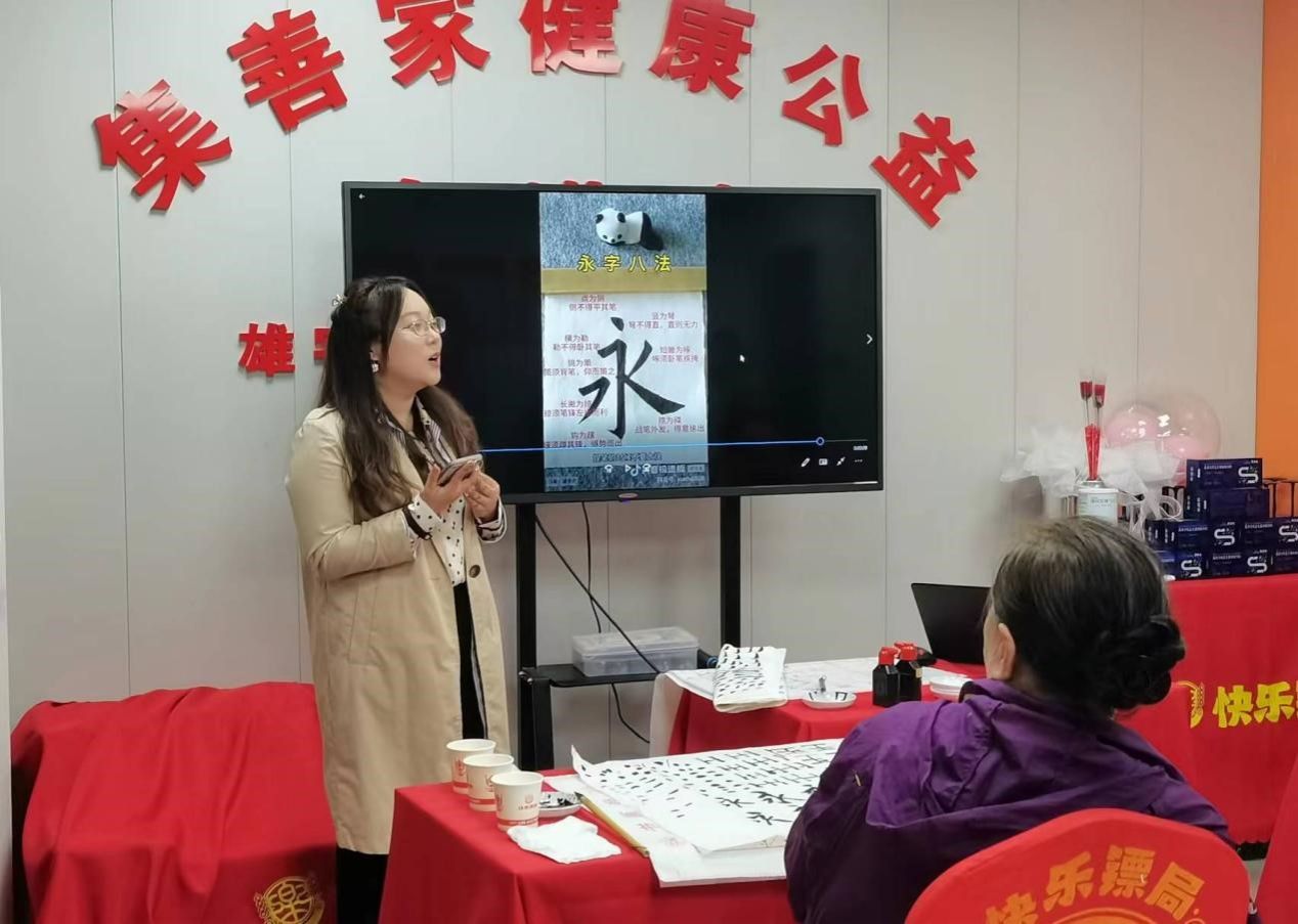 随后,杨斯然同学带领社区老人进行书法的实战演练。在书法的学习和实践中,笔画是基础,掌握基本的笔画方法对于形成个人风格至关重要。杨斯然同学从握笔开始进行示范,纠正社区老人的握笔姿势,接着进行点、横、竖等笔画的相关练习,最后杨斯然同学向社区老人介绍了“永”字八法。在实战阶段中,社区老人收获满满,乐在其中。