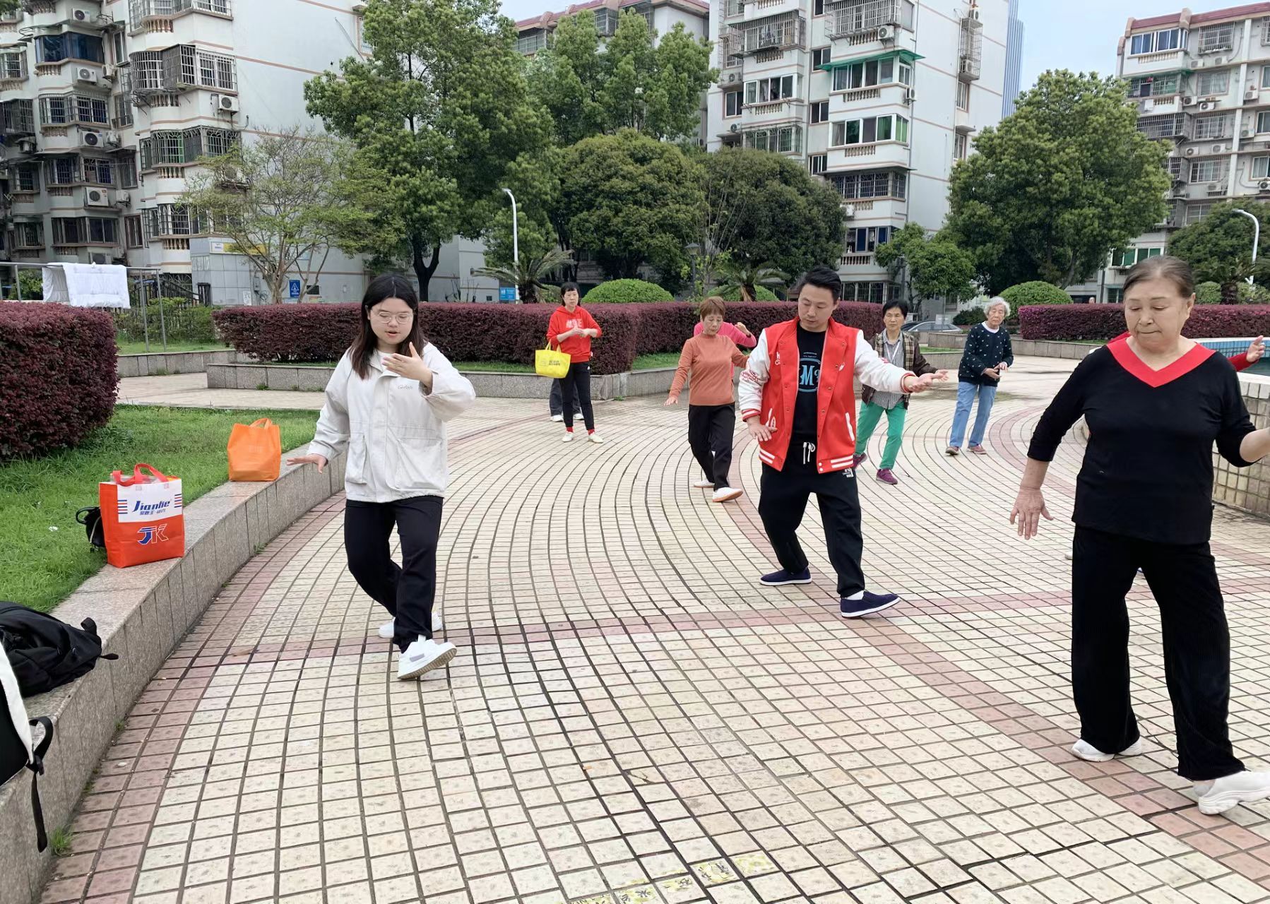 接着,罗晰羽同学向社区老人演示24式太极拳分解动作。在此过程中,不断有附近路过的老人被音乐声吸引,加入我们的太极课程。社区老人对太极拳前三式进行模仿练习,在掌握了基本动作要领之后能够完成太极拳前三式——起势、野马分鬃和白鹤亮翅的连贯动作。