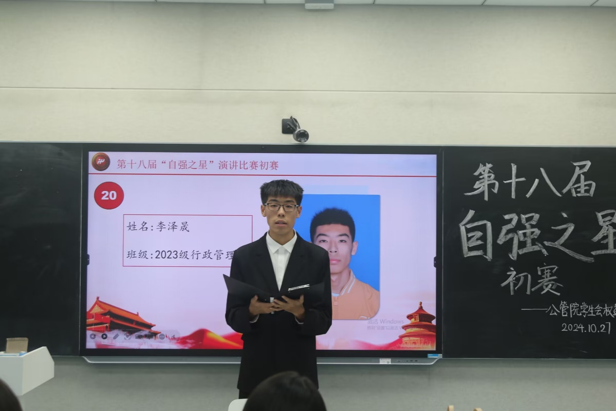 (通讯员:王亚妮思 谭景月 席子坤)为提高同学们的语言表达能力,弘扬自强不息、笃行致远的精神,10月27日晚,9999js金沙老品牌(以下简称“公管院”)学生会权益维护部在景德楼中栋209教室举办第十八届“自强之星”演讲比赛初赛。此次演讲比赛的评委有公管院23级辅导员兰绍娴、21级辩论队队长李青筱、学生会主席团成员王乐怡。