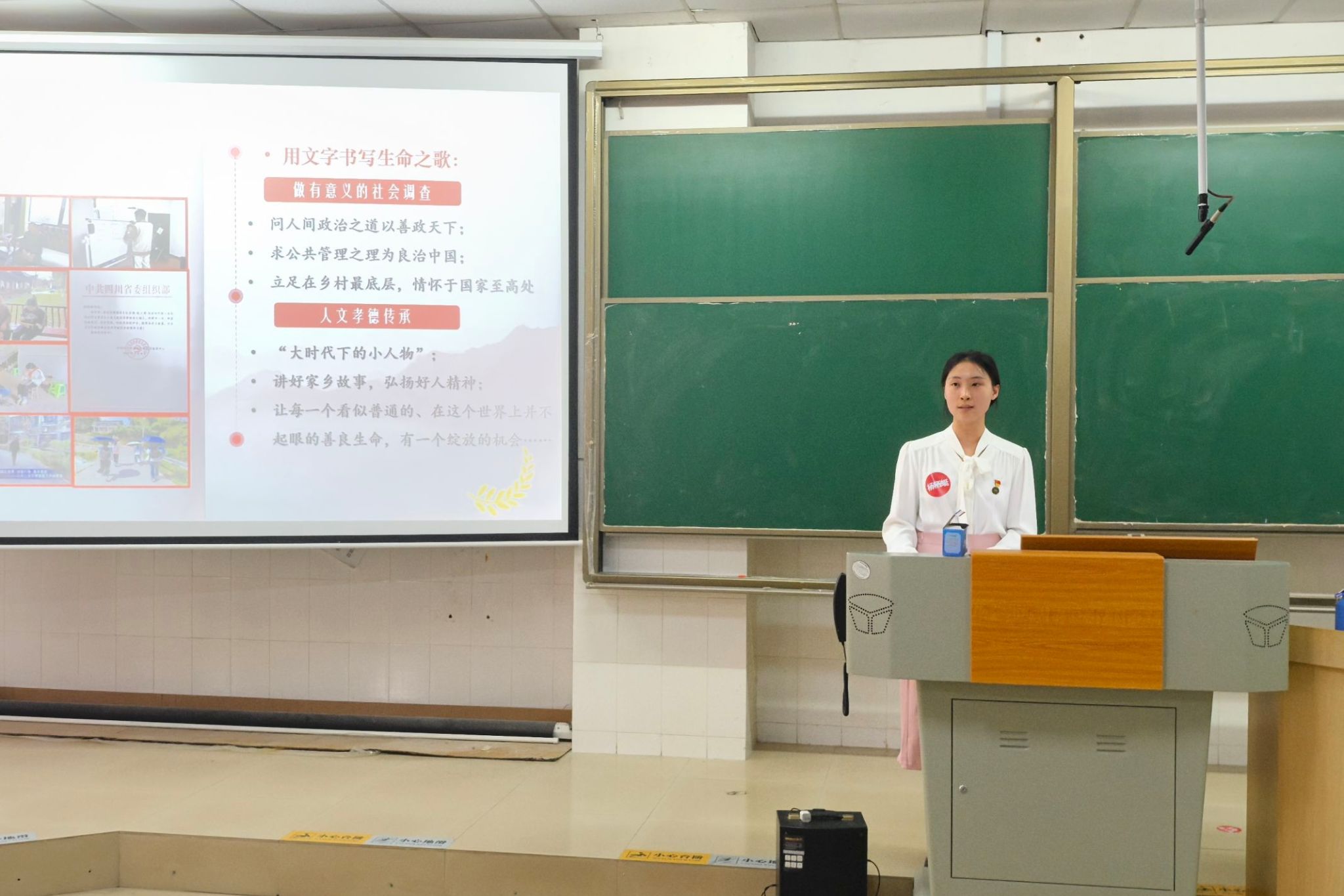 会议伊始,主持人鲁清清介绍“芙蓉学子”评选活动主办方以及活动宗旨。此次评选的奖项分为社会实践奖、公益行动奖、自强不息奖、道德风尚奖和学术科研奖。接着,20个来自不同学院的候选人和团队按奖项依次宣讲。候选人图文并茂,向观众分享他们的奋斗故事,这不仅传递了榜样力量,而且给在场的观众留下了深刻印象。其中,来自公管院的杨粞蜓参与了道德风尚奖的评选,她的宣讲展现了她对公共事务的关心和对社会责任的担当,同时也为公管院学子指明了努力方向。