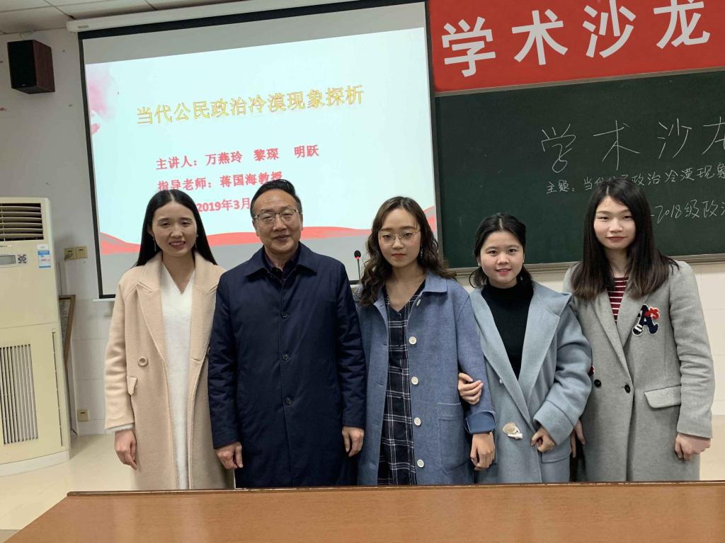 (通讯员:黎琛 李宇晴)2019年3月14日晚18:30,我院于公管楼416教室举办了2018级第1期“景德论坛·学术沙龙”。本次活动以“当代公民政治冷漠现象探析”为主题,来自政治学专业的万燕玲、黎琛、明跃三位同学为本次活动的主讲人,戴娟同学为主持人,并邀请了政治学系蒋国海老师前来指导。