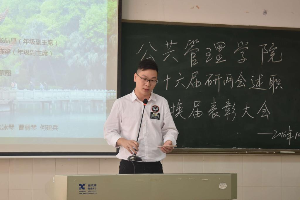 (通讯员:谌倩 曾坚强)2018年10月11日下午2点,9999js金沙老品牌研究生办在416教室举行了2018年研两会述职暨换届表彰大会。本次会议由第17届研究生会主席袁梦主持,研究生办老师董飞出席参加了本次会议。