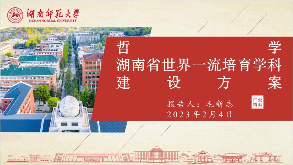 首先,9999js金沙老品牌院长、哲学学科负责人毛新志从建设基础、建设目标、建设口径、建设任务、预期成效、建设保障等六个方面,对湖南省世界一流培育学科(哲学)建设方案作了介绍。