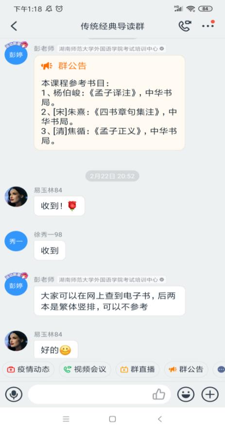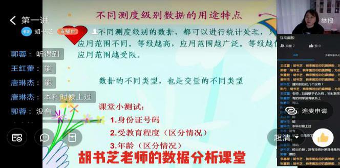 彭婷老师表示,特殊时期进行网上教学,虽然不能当面交流,但是同学们都能主动分享各种电子资源,并积极互动与提问,氛围并不比平时上课差。另外,钉钉平台很给力,可以直播和视频互动,三种模式自由切换。