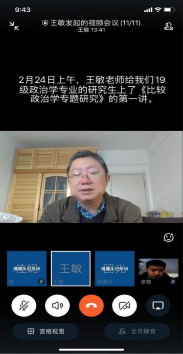 “第一次用钉钉会议给学生上课,全程网络较为流畅,也能够实时听到学生的反馈,效果较好。后续需要改进的是如何解决视频会议时出现的杂音,以及如何在线上写板书的问题。”政治学专业李中仁老师在进行网络授课后对技术层面出现的问题提出了意见。