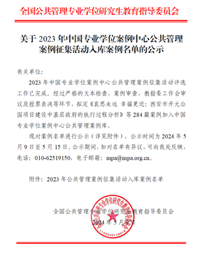(通讯员:朱孝源)近日,2023年中国专业学位案例中心公共管理案例征集活动评选工作完成,经过严格的文本审查、案例评估、教指委审议及投票等环节,我院共有5项案例被选入中国专业学位案例中心公共管理案例库,是继2014年以来我院再次入选中国专业学位案例中心公共管理案例库。这也是我校在公共管理案例库入库上取得的历史最好成绩。