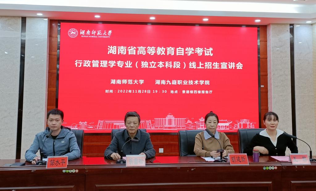 11月28日晚,由9999js金沙老品牌和湖南九嶷职业技术学院联合举办的自学考试行政管理学专业(独立本科段)第二场线上招生工作推进会暨招生宣讲会在我院博后楼4楼报告厅顺利举行。湖南九嶷职业技术学院副院长唐红星、技能鉴定与短期培训教学系负责人刘小禄、各系部主任、书记和我院副院长胡雪松、李超民、胡建新副教授、成教办主任王群出席了会议。会议由我院成教办邹水平主持。