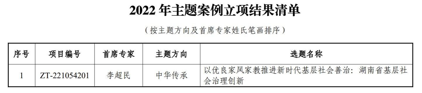(通讯员:姜淑新、方杰)近日,教育部学位与研究生教育发展中心(简称学位中心)面向全国研究生培养单位围绕 “美丽中国”“大国智造”“中国科创”和“中华传承”四个主题开展主题案例征集工作。经过“单位审核推荐”“专家分组评议”“案例专家委审核确认”三级评议审核,我校社会科学处副处长李超民教授为首席专家申报的《以优良家风家教推进新时代社会善治:湖南省基层社会治理创新》案例从184家单位推荐的798个项目中脱颖而出,获得“中华传承”主题立项。此次立项也是我校首次获批该类项目立项。