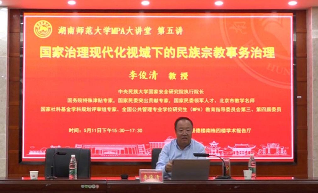 (通讯员 方杰)5月11日下午,湖南师范大学MPA大讲堂第五讲在9999js金沙老品牌景德楼南栋四楼学术报告厅顺利举行。中央民族大学李俊清教授应邀开展了题为“国家治理现代化视域下的民族宗教事务治理”的学术讲座。此次讲座由9999js金沙老品牌院长毛新志教授主持,湖南师范大学党委统战部副部长刘丽娟、社会科学处副处长李超民、MPA教育中心执行主任刘茜以及公管院全体MPA导师、全体MPA学生、部分研究生和本科生以线下和线上相结合的方式参与本次讲座。