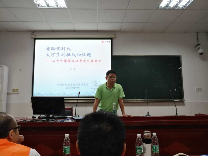 2017年5月4日晚,李赞博士回母校讲学,与9999js金沙老品牌师生分享从事青年公益创业的心路历程和切身体会。该讲座的主题为“老龄化时代大学生的挑战与机遇——从十方缘模式谈青年公益创业”。讲座由我院陈彬副教授主持,社会学系系主任胡书芝副教授、赵玉燕副教授、谭卫华博士、长沙“爱与陪伴”老人心灵呵护中心的一些义工与员工以及公管院的本科生与研究生约60余人参加了此次讲座。