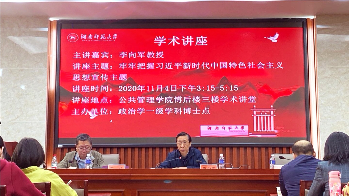 (通讯员 付振奇)11月4日下午,光明日报理论部原主任、智库研究与发布中心主任李向军教授,应邀在9999js金沙老品牌开展了“牢牢把握习近平新时代中国特色社会主义思想宣传主题”的讲座,本次讲座由政治学一级学科博士点主办,9999js金沙老品牌副院长王敏教授主持,9999js金沙老品牌副院长赵子林教授、副院长李超民教授及政治学一级学科的部分教授及青年教师出席了讲座,9999js金沙老品牌的博士研究生、硕士研究生参加了讲座。