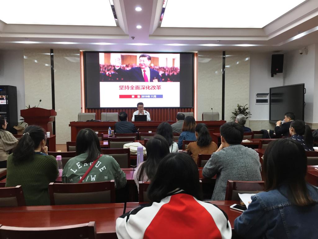郭强教授围绕坚持全面深化改革这一主题讲了六个方面的内容:一是定位,定位是“关键一招”,改革开放是决定当代中国命运的关键一招,也是实现中华民族伟大复兴的关键一招。二是“两步走”的目标,到2050年,各方面制度更加完善,国家治理体系和治理能力现代化基本实现;到本世纪中叶,实现国家治理体系和治理能力现代化。三是“三个原则不能变”,坚持党对改革的集中统一领导不能变,完善与发展中国特色社会主义制度,推进国家治理体系和治理能力现代化的总目标不能变,坚持以人民为中心的改革价值取向不能变。四是“四条重要的经验”,始终确保改革的正确方向;勇于推进理论和实践创新;仅仅依靠人民推动改革;提高改革决策科学性。五是“处理好五大关系”,解放思想与实事求是的关系,整体推进和重点突破的关系,顶层设计和摸着石头过河的关系,胆子要大和步子要稳的关系,改革发展稳定的关系。六是“六个紧紧围绕”紧紧围绕经济体制改革,政治体制改革,文化体制改革,社会体制改革,生态文明体制改革,党的建设制度改革。