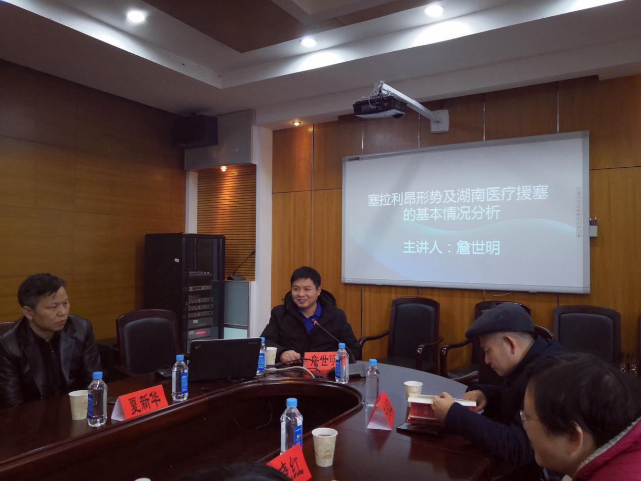 中国社会科学院《西亚非洲》编辑部副主任詹世明结合自己在塞拉利昂深入调研的成果,从“政治形势”、“经济形势”、“医疗卫生合作”等三方面分析了塞拉利昂形势及湖南医疗援塞的基本情况。詹教授以真实有趣的事例,幽默风趣的语言与参会人员作了主旨讲座。