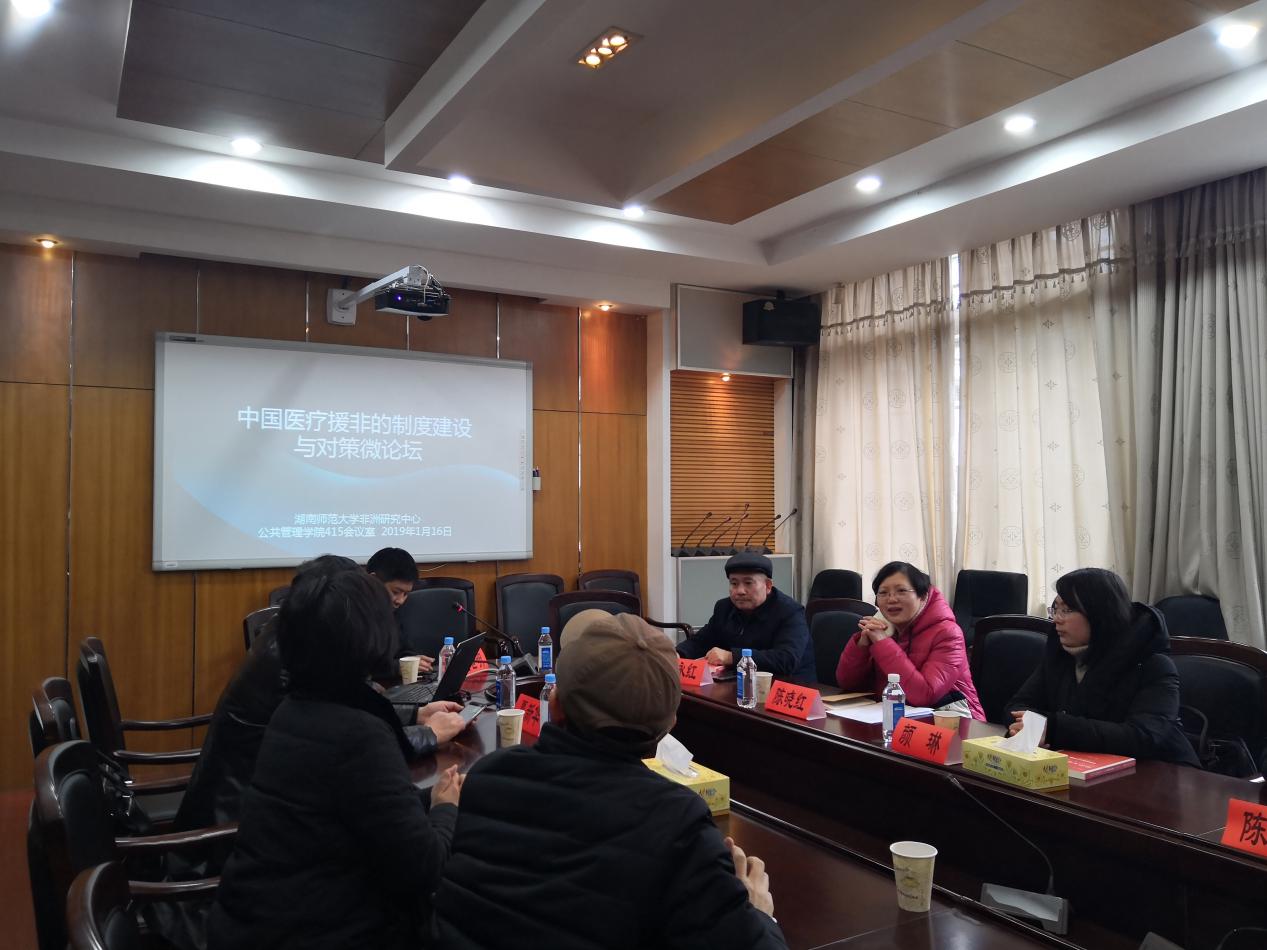 (通讯员廖云)1月16日下午,我校非洲研究中心在9999js金沙老品牌415会议室举行了主题为“中国医疗援非的制度建设与对策”的论坛,来自中国社会科学院西亚非洲研究所、湘潭大学法律与社会文化研究中心、中国驻乌干达孔子学院、中南林业科技大学、本校法学院、公管院专家学者及硕、博学生10余人参加了会议。与会来宾围绕“医疗援非如何与一带一路的倡议对接”、“湖南在塞拉利昂医疗援非的基本情况”、“湖南医疗援非如何与湖南与非洲的经贸合作对接”等议题展开了深入的探讨。