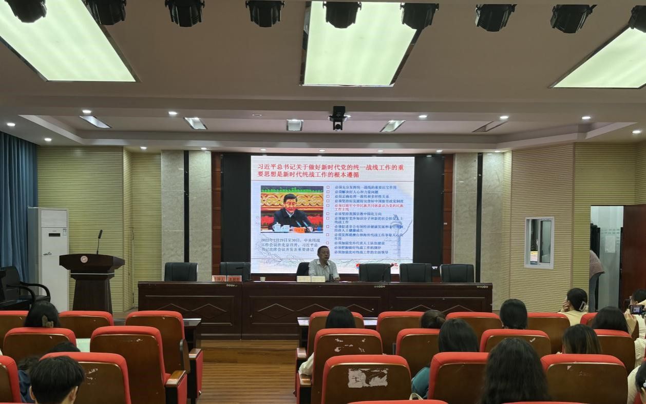 (通讯员 欧阳子茜)2023年11月1日19点,我院“正大日新”研究生大讲堂第十三讲在博士后四楼报告厅顺利举行。湖南省社会主义学院周述杰教授应邀开展了题为“以铸牢中华民族共同体意识为主线,深化民族工作理论与政策研究”的学术讲座。讲座由我院统一战线学二级学科硕士学位点导师李超民教授主持,校党委统战部肖白老师、我院社会学系副教授谭卫华、王欣,研究生办胡耀飞老师以及180余名研究生参加本次学术讲座。