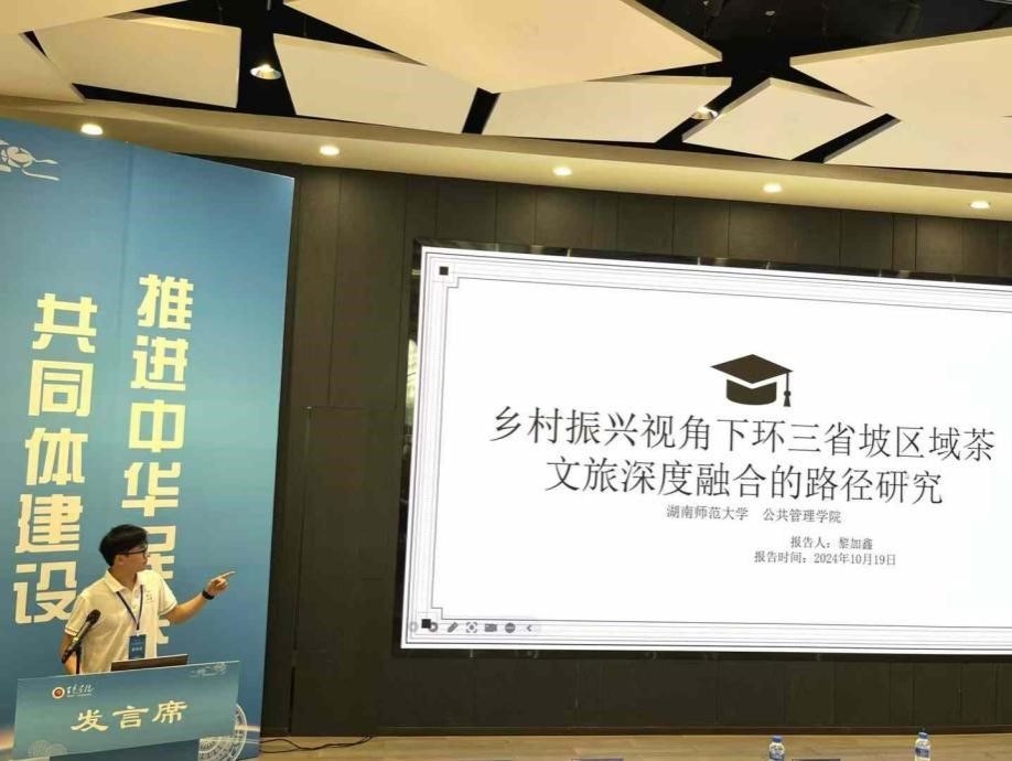 在第一组分会场中,黎加鑫就其论文《乡村振兴视角下环三省坡区域茶文旅深度融合的路径研究》作出发言。他首先梳理了学界对茶文旅研究的脉络,并指出对湘桂黔环三省坡茶文旅研究的理论价值与实践意义,其次根据调研资料指出了环三省坡茶文旅融合的几种模式。最后,他提出要从政府引领规划、打造三省边界特色旅游新名片、实施新型人才培养体系等方面进一步促进湘桂黔环三省坡茶文旅融合,助力乡村振兴。