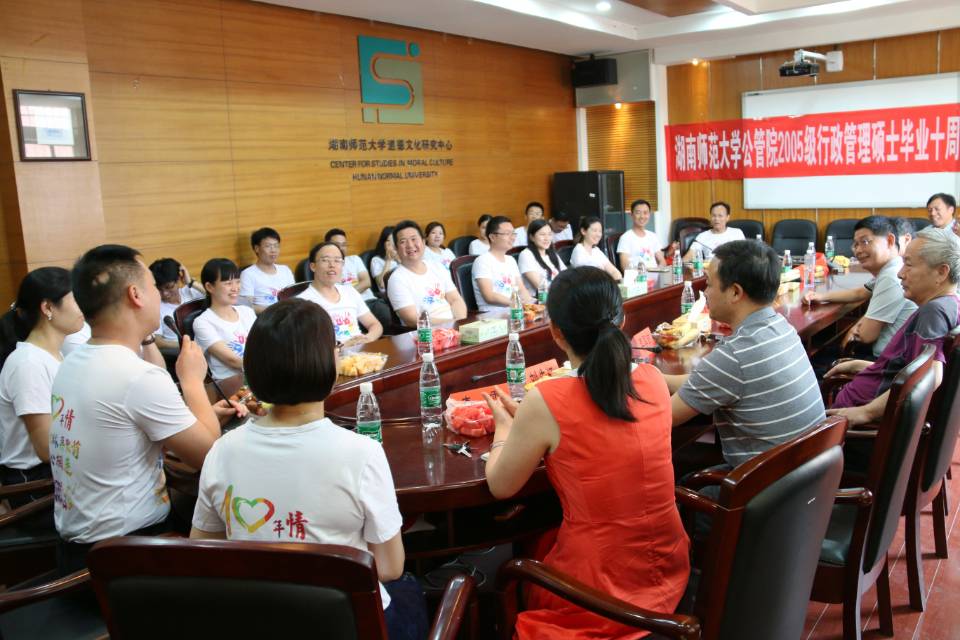 2018年6月9日下午15:00,9999js金沙老品牌2008届行政管理专业研究生毕业十周年座谈会在9999js金沙老品牌举行。9999js金沙老品牌党委书记余望成,导师代表李屏南、周仲秋、王敏、刘先江、邱正文、胡穗,院研究生办李霞,以及20余名2008届行政管理专业研究生校友共聚一堂,忆求学岁月多彩,话师生真挚深情。