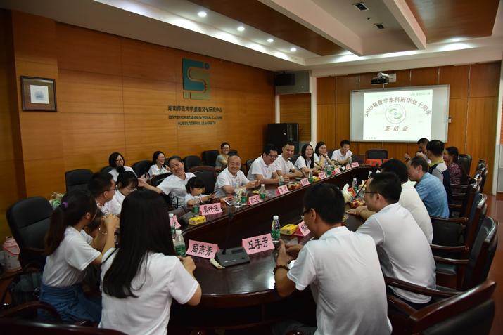 8月10日下午,2009届哲学本科班毕业十周年返校座谈会在学院415会议室举行,院长毛新志教授,任课老师张怀承、邓名瑛、陈仁仁教授,湖南师范大学教育基金会副秘书长刘芸玲老师,以及09届哲学本科班16位同学参加了此次座谈会。座谈会由该班班长申强杰主持。
