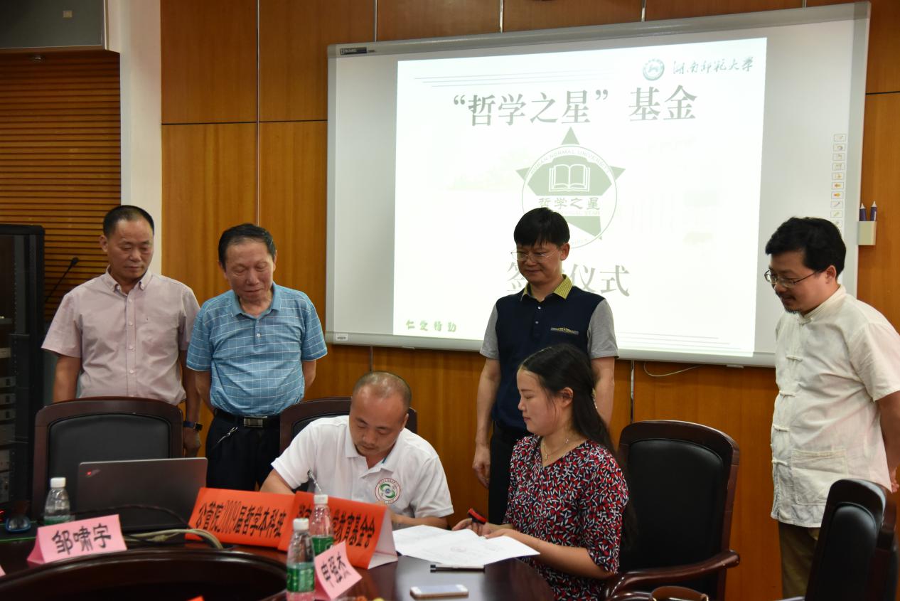 随后,09届哲学本科班向学院献礼,成立“哲学之星”基金,以感念母校、鸣谢恩师、致敬哲学。在基金签约仪式上,学校教育基金会刘芸玲老师与09届哲学本科班代表邓洁在捐赠协议书上签字,宣告基金成立。该基金的设立,旨在以绵薄之力助推学院培养有仁德、有智慧、有情怀、有担当、有能力的哲学本科人才。具体而言,第一,帮助哲学系寒门学子顺利完成学业;第二,鼓励哲学系学生潜心读书、致力学术、热心文教;第三,支持哲学系本科生积极参加有益社会实践活动。