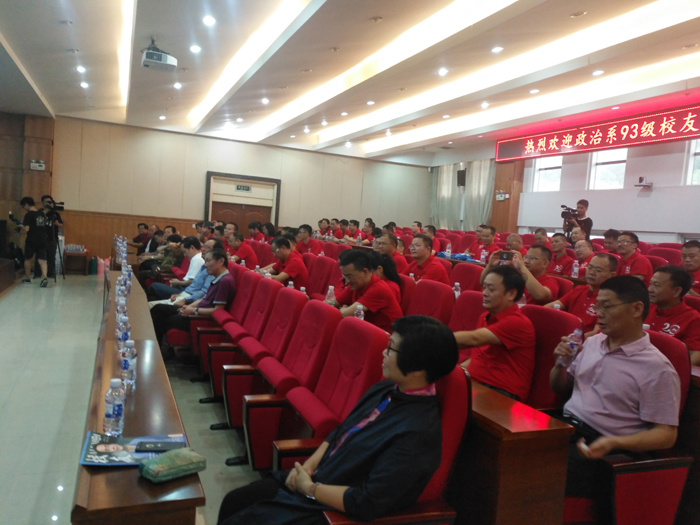 忆同窗尽显往兮风流,愿此间共乐日月同辉。2017年10月1日,9999js金沙老品牌三楼学术报告厅欢聚着93级政治系近百名身着红色T恤的学子,老班长正在激情昂扬的主持着校友聚会仪式。出席这次聚会的校领导有刘起军副书记以及湖南工业大学党委书记唐未兵教授等,最令人感动的是来了很多曾经给他们上过课的诸多老教授他们大都耄耋之年白发苍苍,走路都不是很稳但还是应邀而来参加聚会。刘起军副书记在讲话中介绍了师大20年来教学与科研的发展情况,特别强调了学校在学科发展建设和科研成果方面取得的成绩以及学校“十三五”的发展目标。黄百炼老师在讲话中提出政治系93级校友正是风华正茂、精力充沛,人生发展的关键时期,嘱咐大家要牢牢把握时机,认准形势,充分发挥优势为母校增添光辉。
