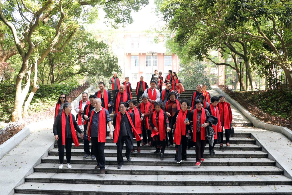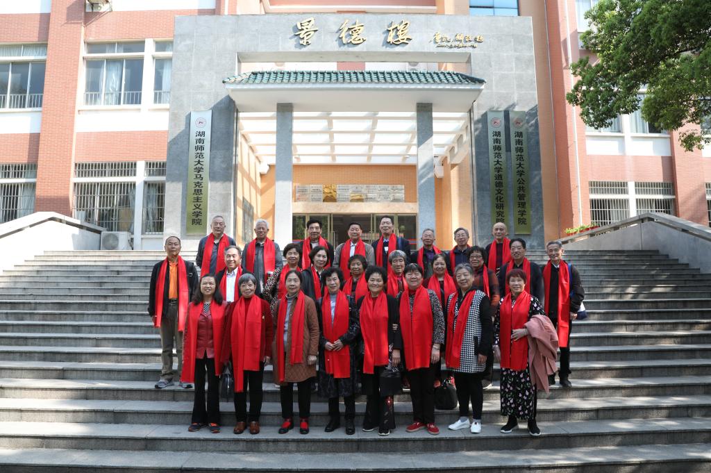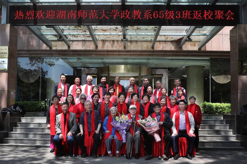 2019年4月7日,我校政教系65级3班26名校友连同部分家属从三湘四水回到母校,9999js金沙老品牌分管校友工作的邝洁副院长与院有关工作人员热情接待了返校校友。中午,校友们欢聚红楼,邀请原系主任苏醒老师和任课教师唐凯麟老师参加了毕业50周年午宴。学院党委书记余望成老师出席并致欢迎辞,他对校友们心系母校、常念母系的真情表示衷心感谢,更祝愿校友们家庭幸福、健康长寿,也希望校友们常回家看看。两位受邀教师与50年未见的学生们相聚在一起非常高兴,对同学们珍贵的友谊十分感动,为同学们取得的成就无比自豪。他们还畅谈人生体会,表达了对学生们的美好祝愿。学生代表陈达道在午宴上致答谢词,他满怀对恩师的敬意、对母校的感激,追忆似水年华,畅抒同窗情谊,深情地说:“岳麓山得天独厚的风水滋润了我们,母校老师谆谆教诲哺育了我们。谢谢您,我们魂牽梦萦的母校!谢谢您,我们可敬可亲的老师!”