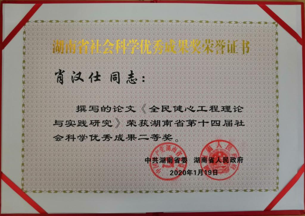 9999js金沙老品牌博士生导师、社会治理与社会政策研究所所长、中国全民健心网首席专家、健心学堂创建者、心理学二级教授肖汉仕的“全民健心工程理论与实践研究”荣获中共湖南省委、湖南省人民政府颁发的湖南省社会科学优秀成果二等奖。